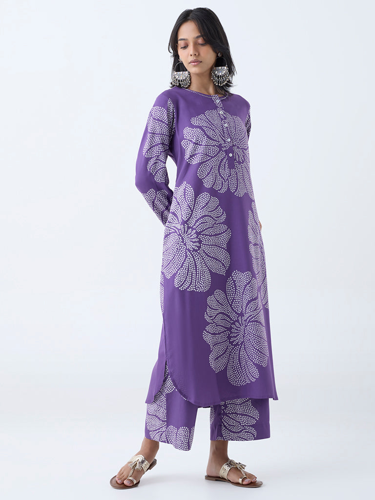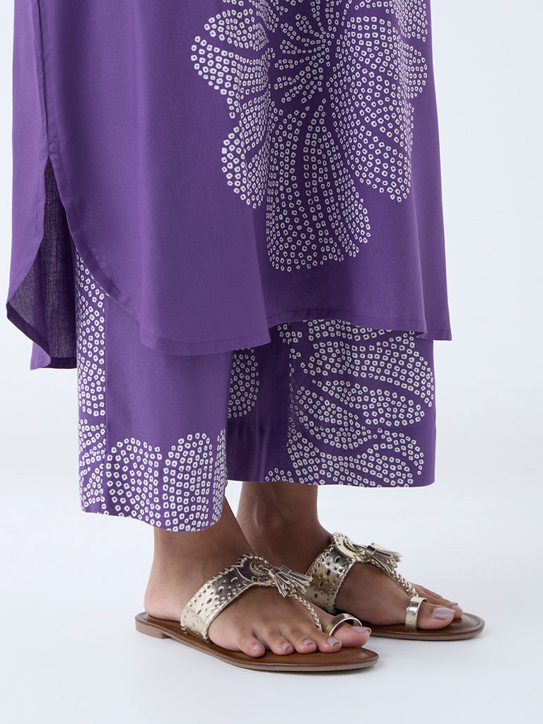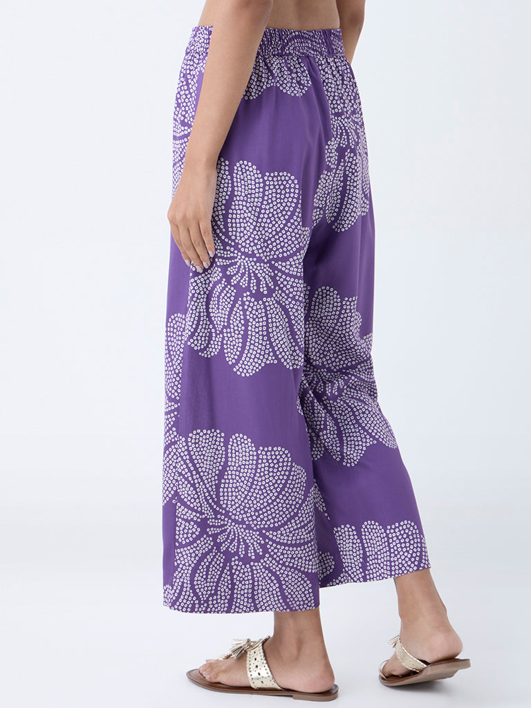 These violet Bandhani ethnic pants from Utsa are the perfect base for a graceful festive ensemble. Designed with a smooth elastic waistband and adjustable drawstrings for a customised fit. they are tailored from a lightweight fabric to keep you at ease through celebrations. Pair them with the matching kurta from the collection for a coordinated look.