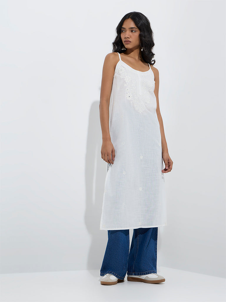 Utsa White Floral Embroidered Cotton Straight Kurta