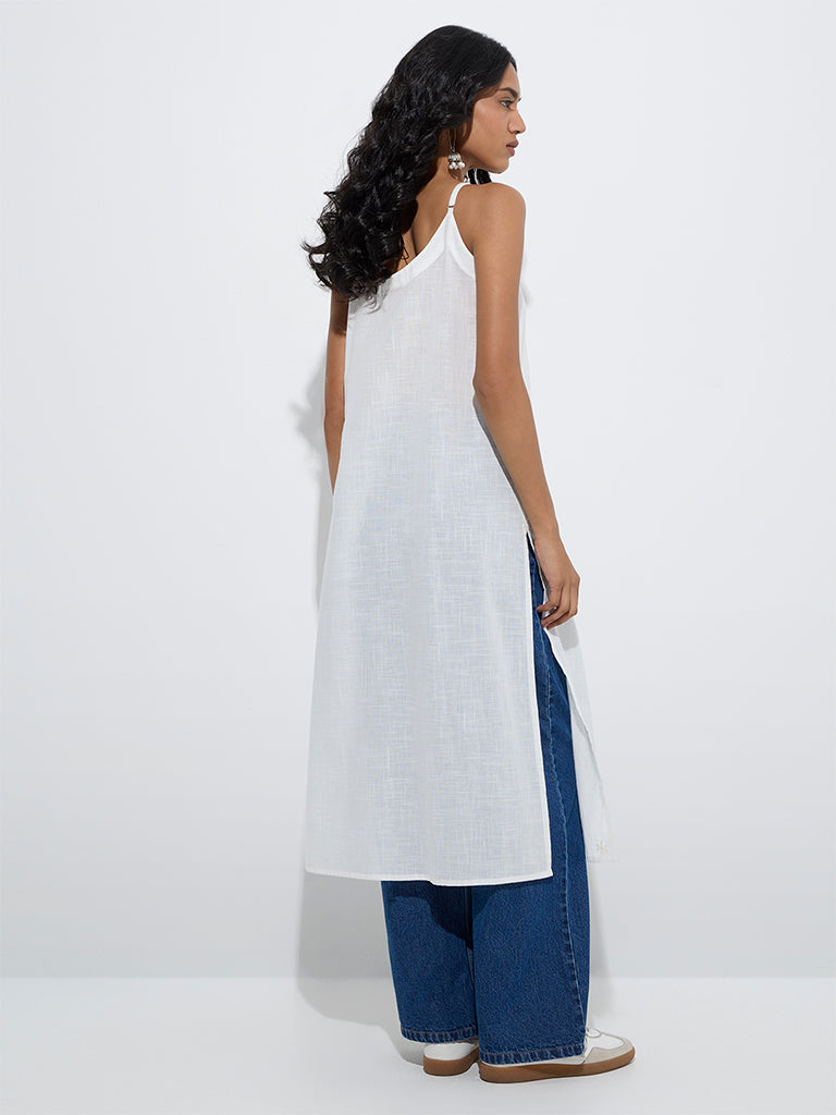 This white kurta from Utsa is crafted from pure cotton and flaunts floral embroidery at the yoke for feminine charm. Cut in a straight silhouette. it’s styled with a scoop neck and adjustable shoulder straps for a custom fit that moves with you.