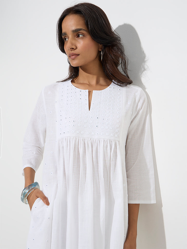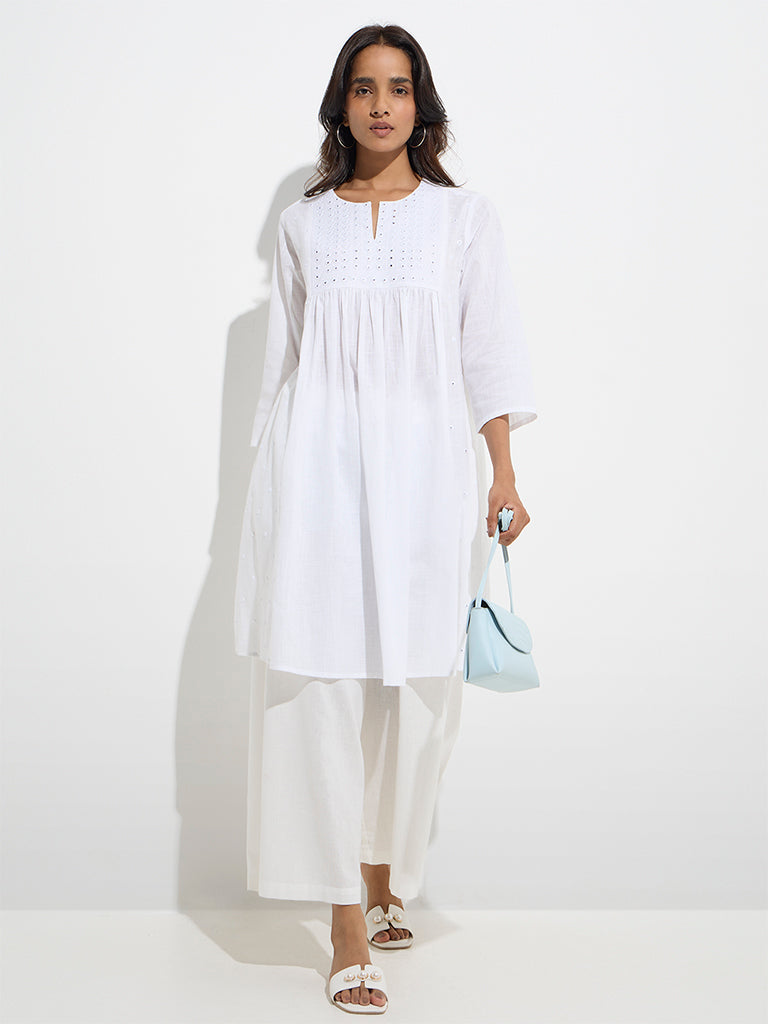 Utsa White Mirror-Detailed A-Line Cotton Kurta