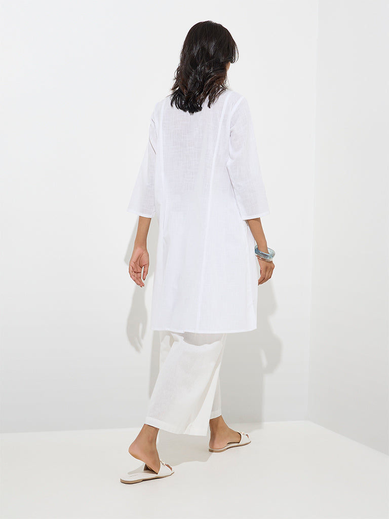 This white kurta from Utsa is a timeless addition to your everyday ethnic wardrobe. Made from pure cotton in an A-Line frame. it features mirror embroidery along the yoke that adds just the right touch of detail. Designed with a split neckline. three-quarter sleeves. and slip pockets. it pairs elegance with effortless ease.