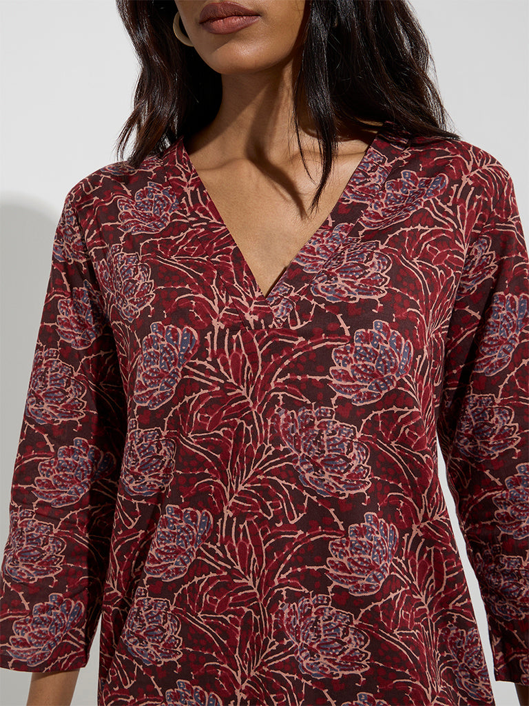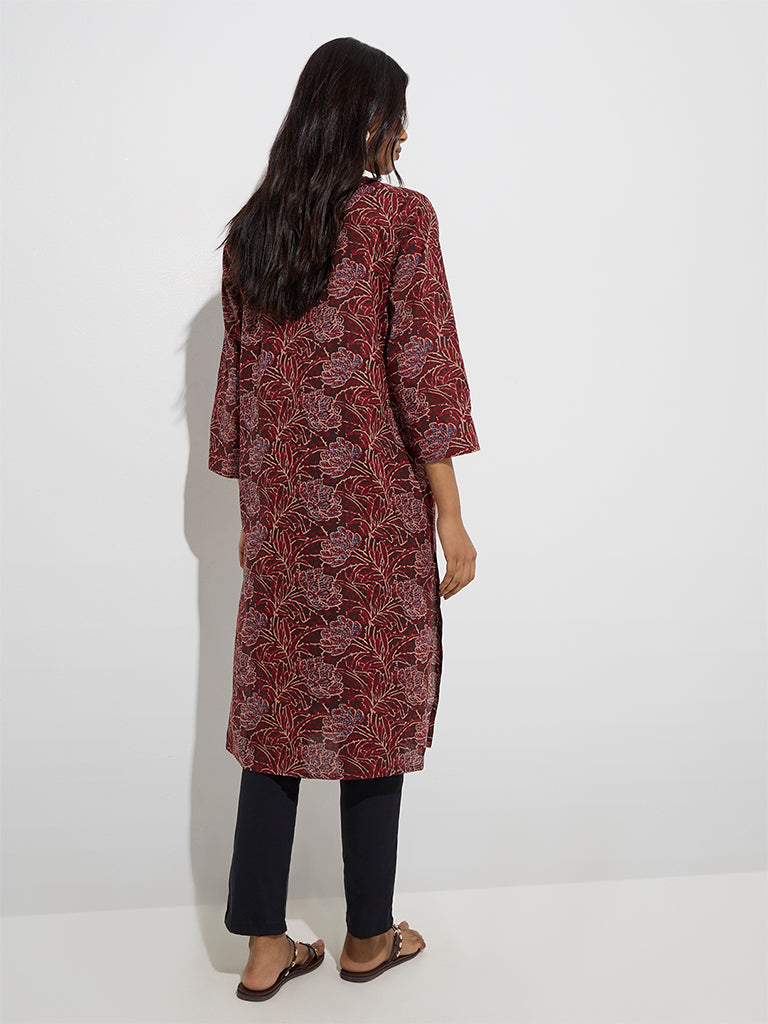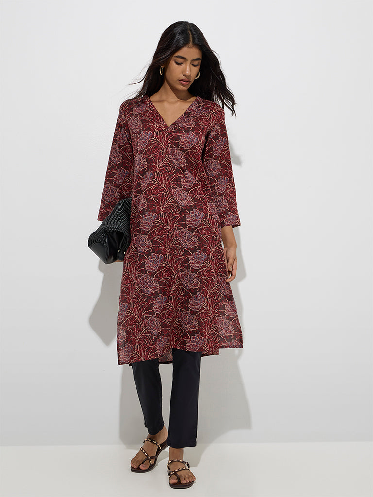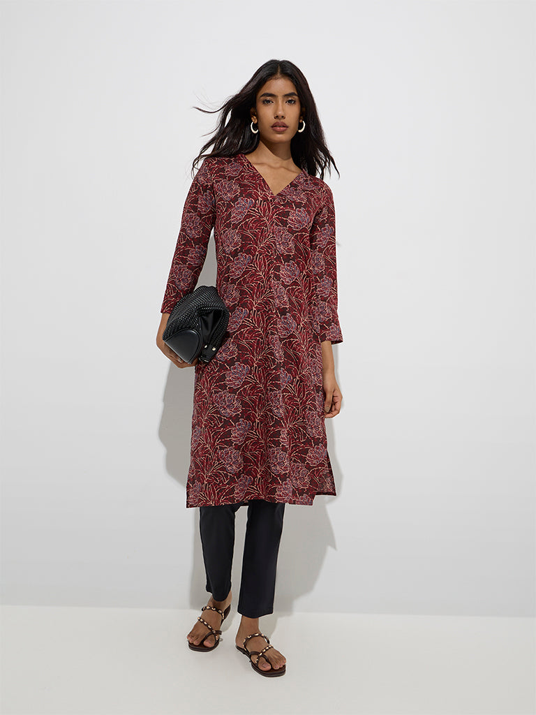 Utsa Wine Floral Pattern Straight Kurta