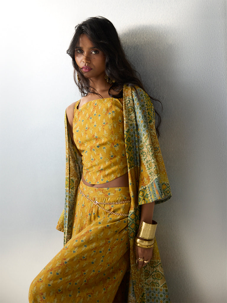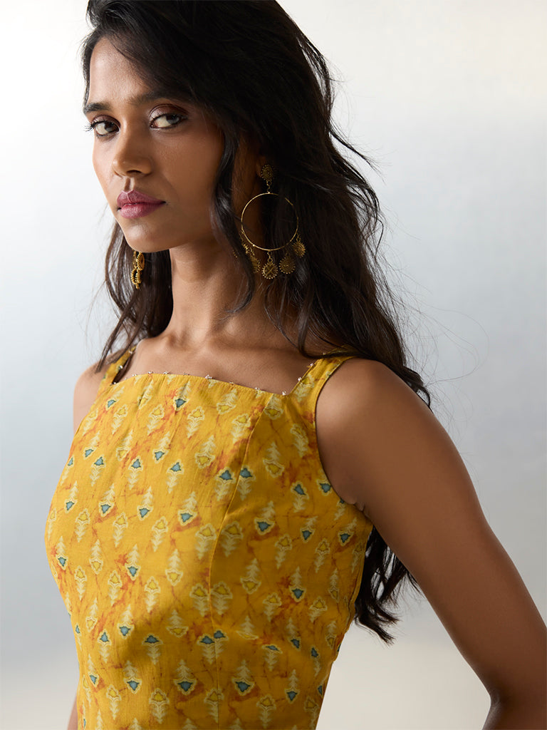 This yellow top from Utsa showcases vibrant motifs that accentuates its ethnic appeal. It is framed with a square-neck. adjustable straps and a comfortable smocked back. Spun from a breathable fabric for uncompromised comfort.