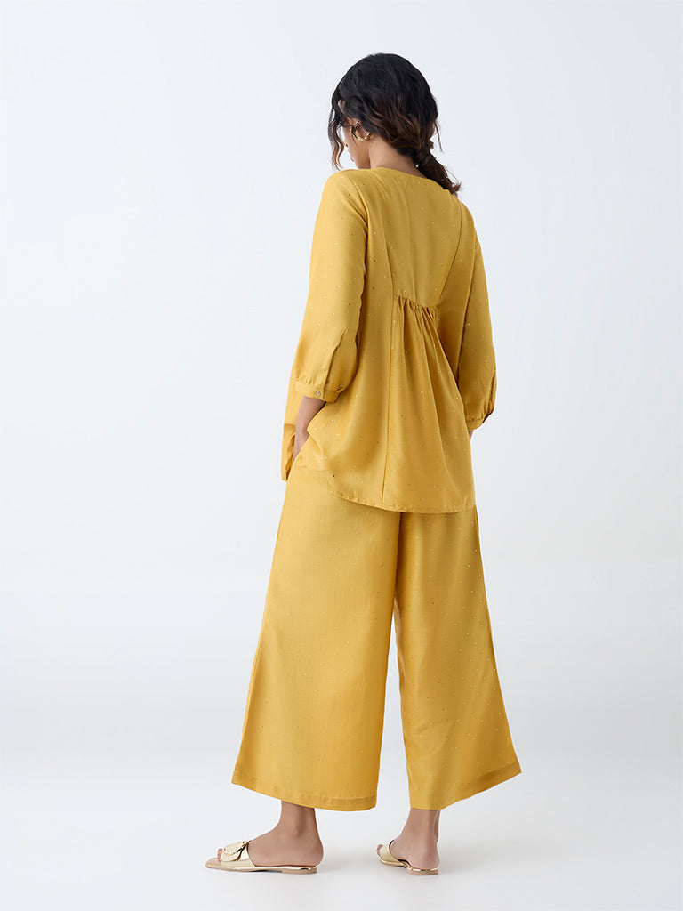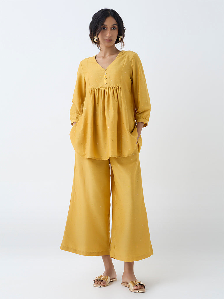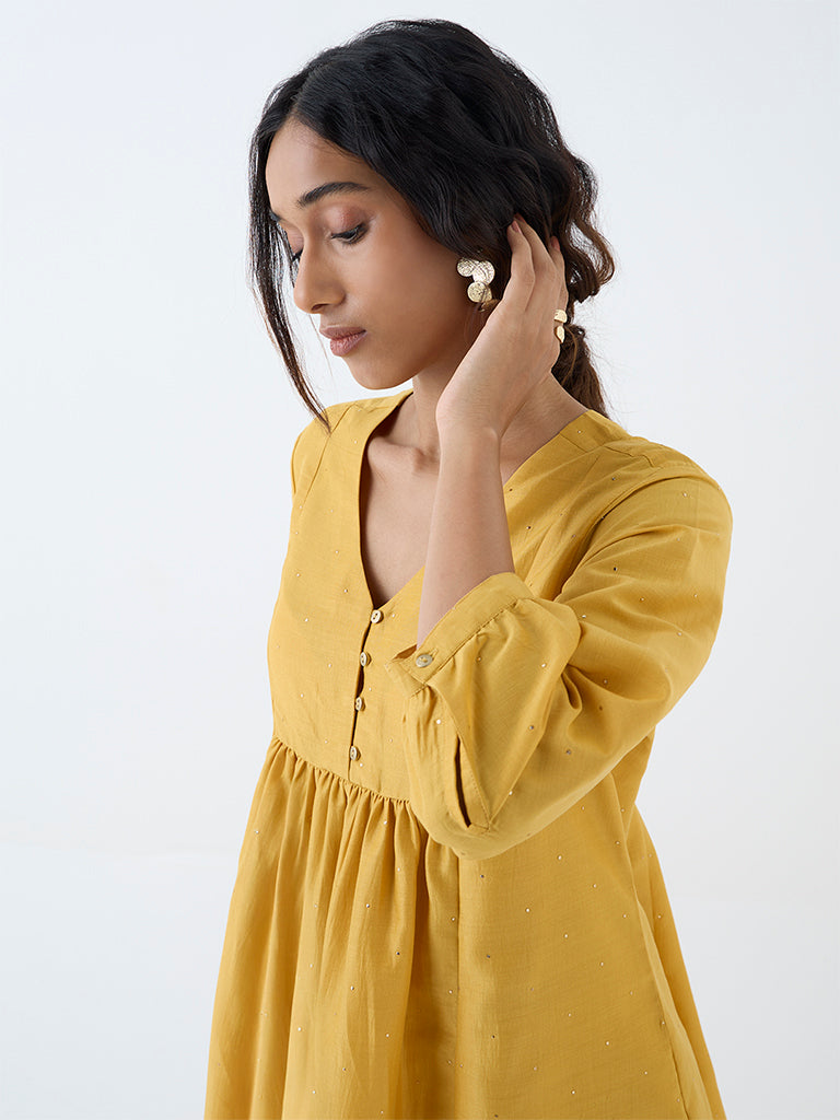 This yellow kurti from Utsa brings a cheerful twist to festive dressing. Rendered in a fit-and-flare silhouette. it’s crafted from quality fabric and highlighted with glimmering accents for subtle shine. The design is framed with a V-neck. four-button placket. and airy blouson sleeves for graceful movement.