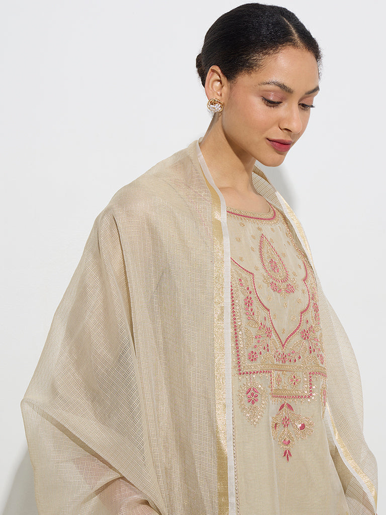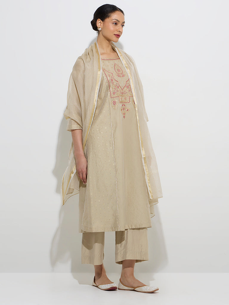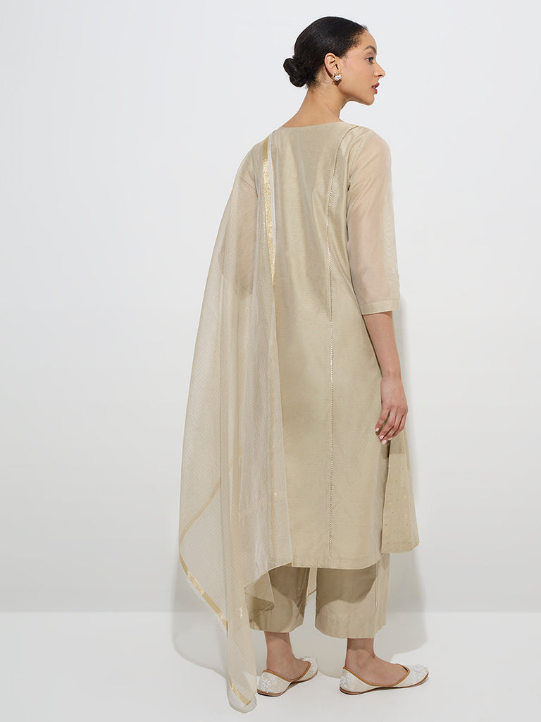 Vark Beige Cotton-Blend Kurta. Palazzos and Dupatta Set