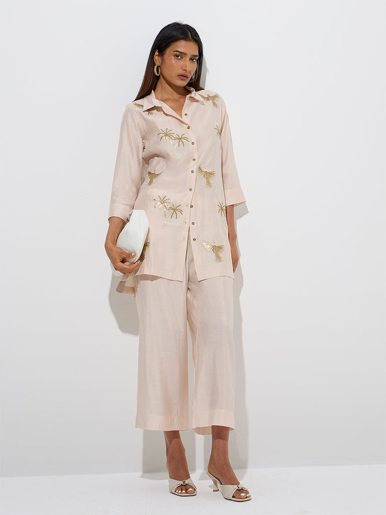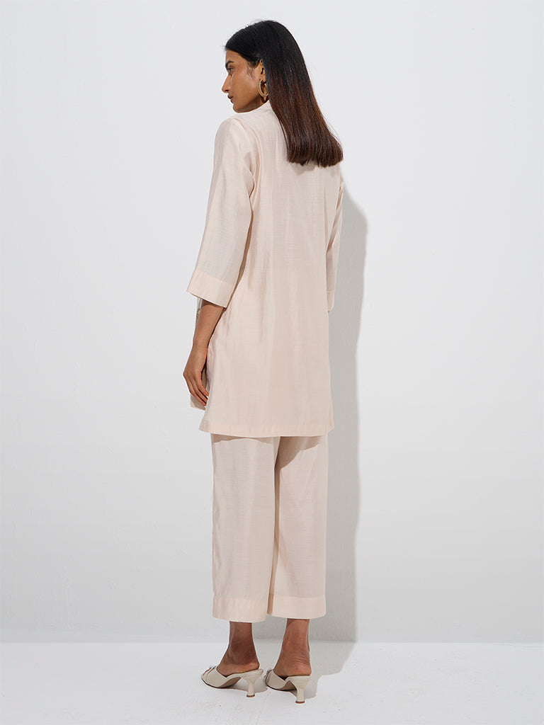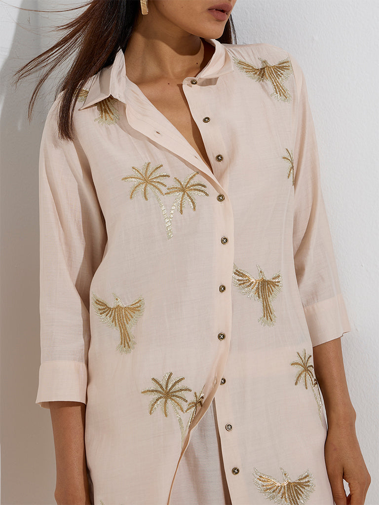 This beige ethnic set from Vark is decorated with intricate embellished detailing inspired by birds and tropical motifs. The lightweight tunic features a structured collar. button placket. and three-quarter sleeves for a refined finish. Paired with matching ethnic pants featuring an elasticated waistband. it offers both style and comfort for festive occasions.