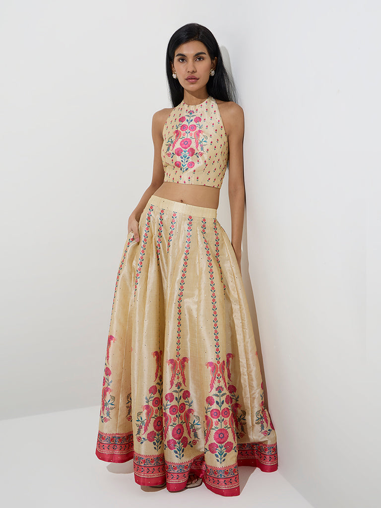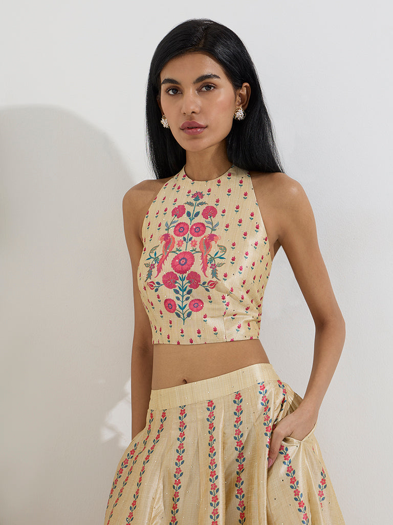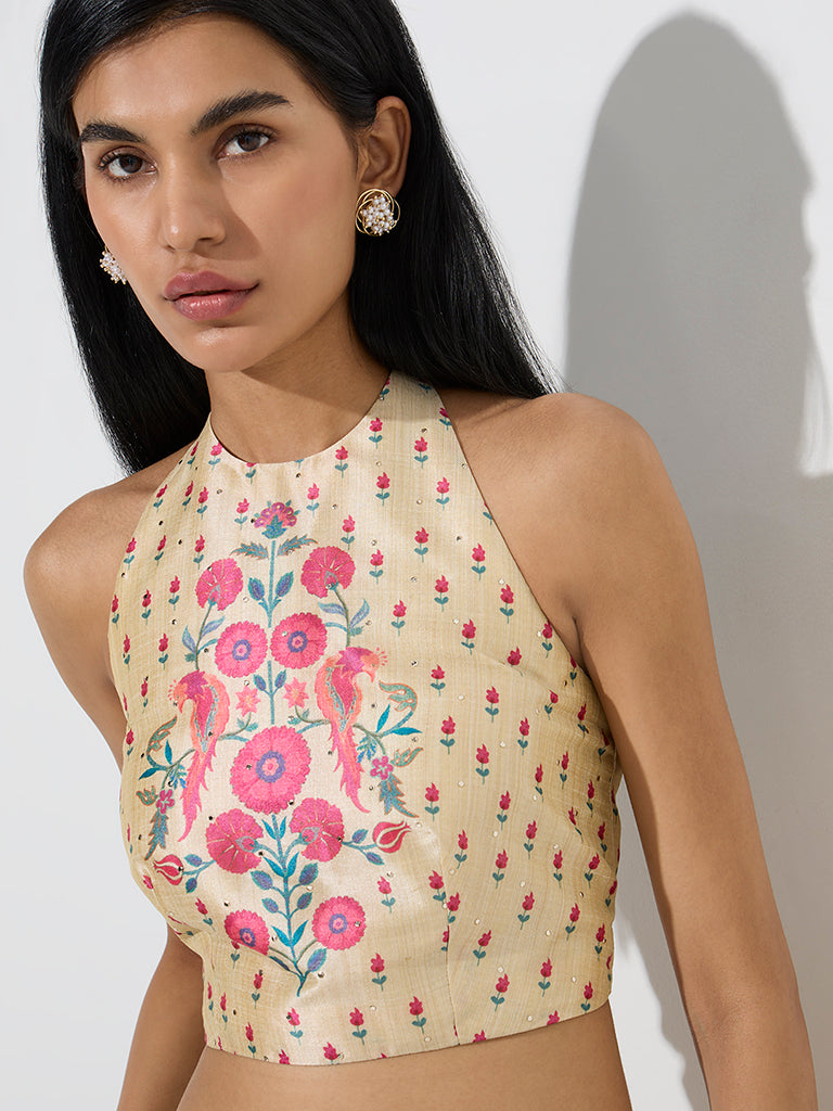 Vark Beige Floral Design Halter-Neck Ethnic Top