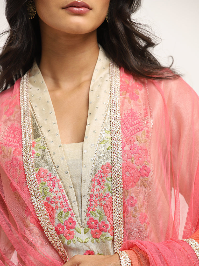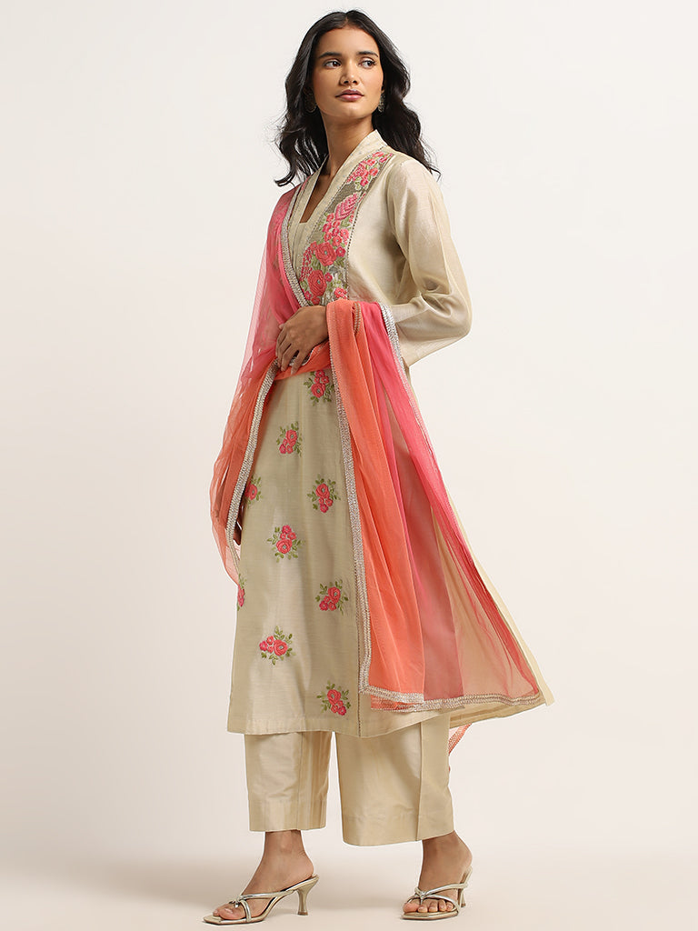 Vark Beige Floral Straight Kurta. Ethnic Pants & Dupatta Set