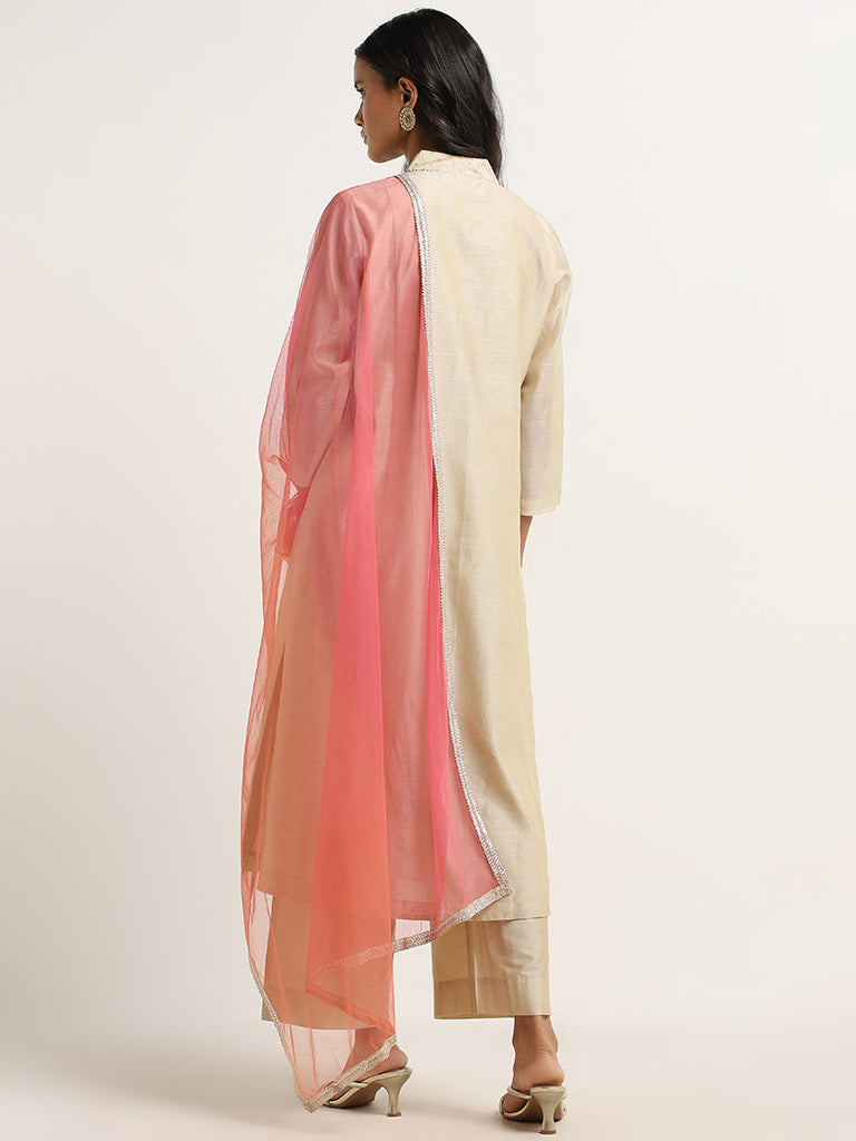 Vark introduces this elegant beige set comprising a kurta. a pair of ethnic pants. and a dupatta. The kurta is tailored in a straight silhouette adorned with intricate floral embroidery. It is complemented by a V-neckline and three-quarter sleeves. The coordinated pants are designed with an elasticated waist for comfort. Completing the ensemble. the net dupatta is adorned with delicate zari trims. adding a touch of sophistication to the outfit.
