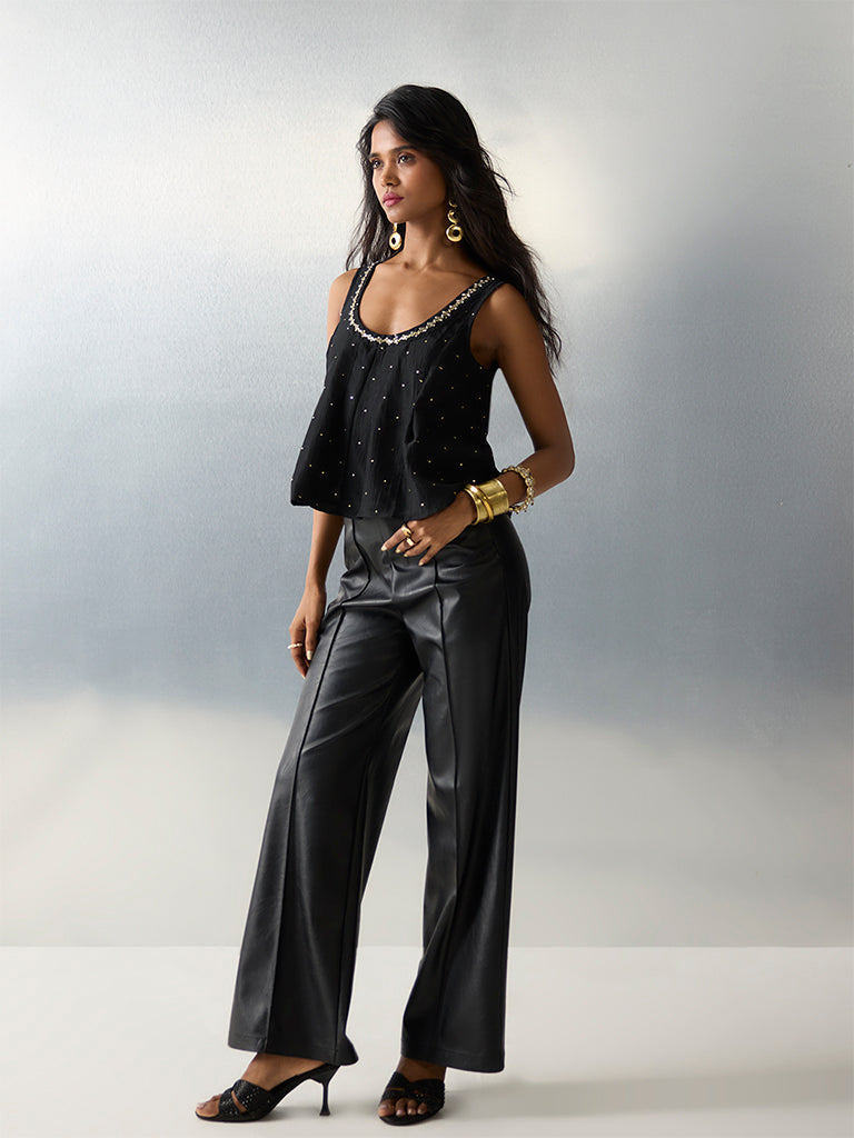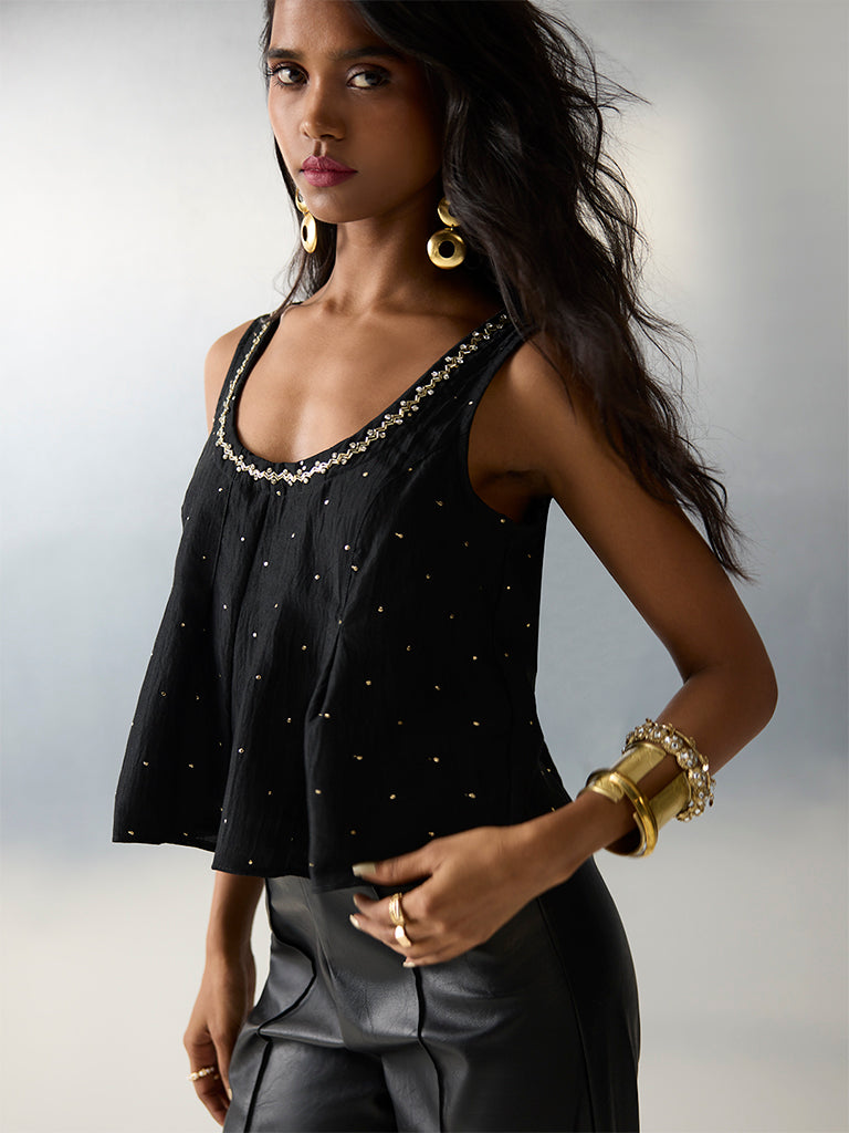 This black ethnic top from Vark is framed with a scoop neck. a sleeveless cut and a smocked back for a flexible fit. Showcasing embellished details. it is woven from a high-quality fabric. offering a festive design and uncompromising comfort.