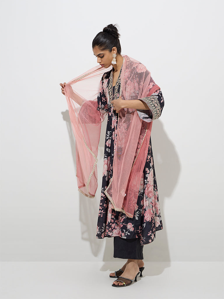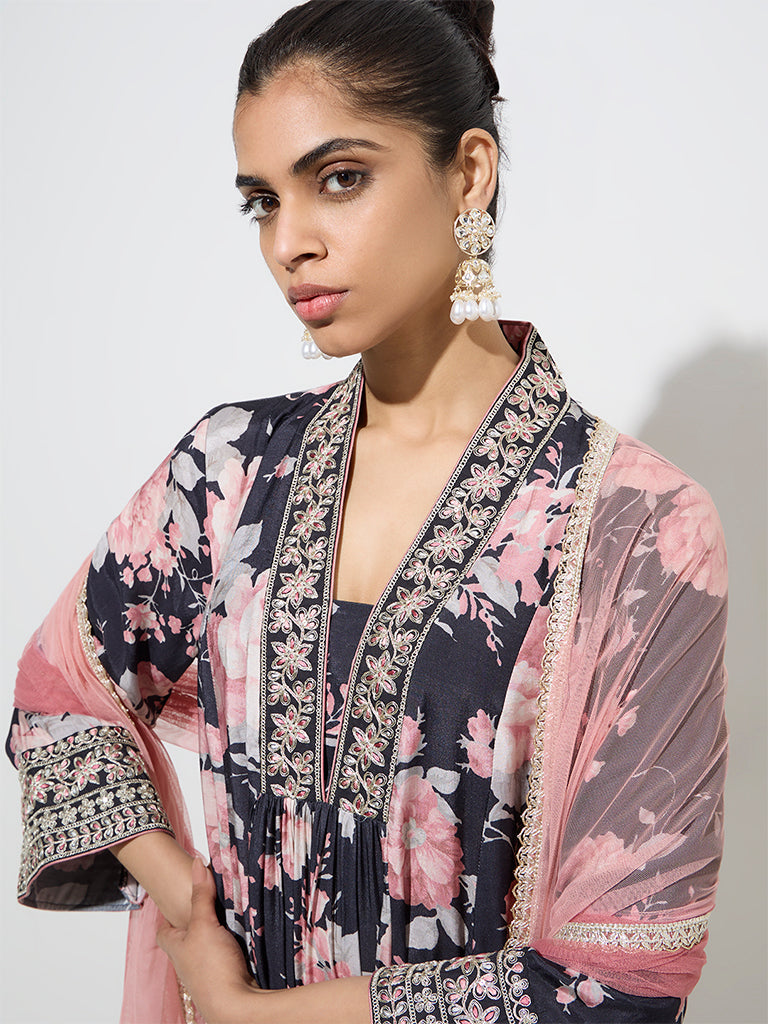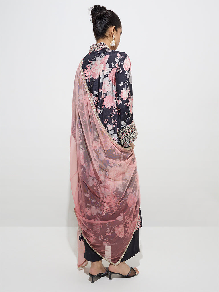 Vark Black Floral A-Line Kurta. Palazzos and Dupatta Set