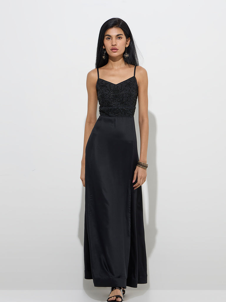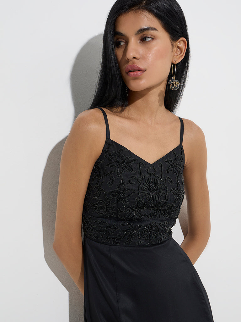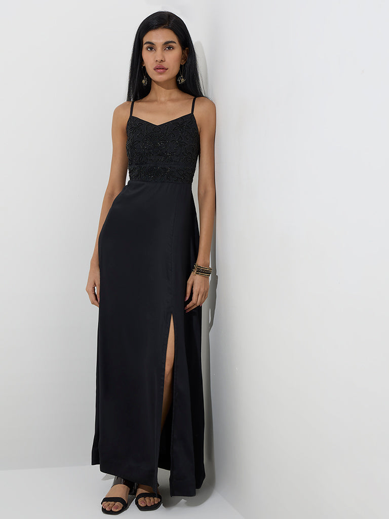 Turn heads with this black dress from Vark. where intricate floral embellishments elevate the bodice with elegant detail. Constructed from quality fabric. it features a flattering V-neck. adjustable shoulder straps. and a smocked back for a comfortable fit. A sleek side slit adds just the right touch of drama to this chic ensemble.