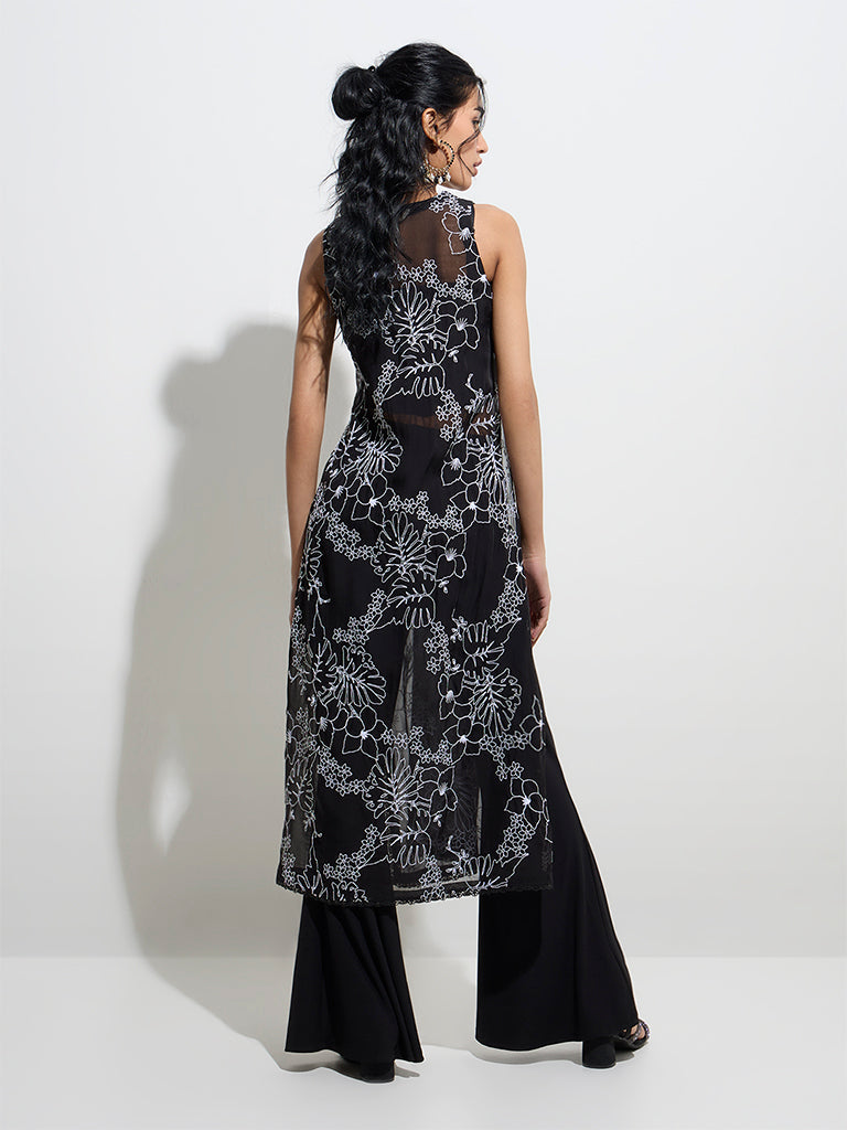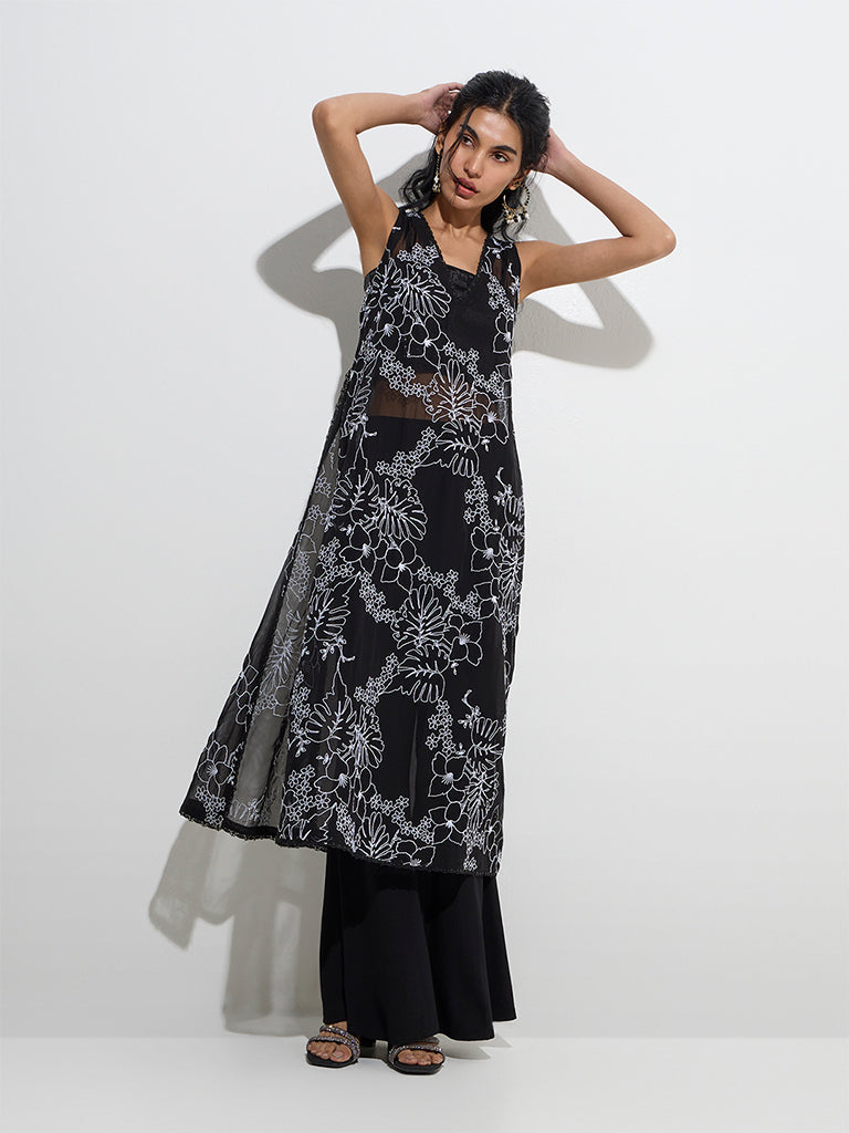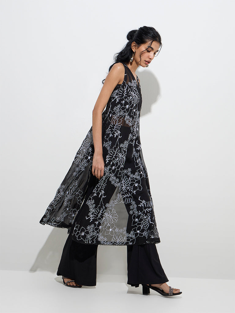 Vark Black Floral Embroidered Mesh A-Line Kurta
