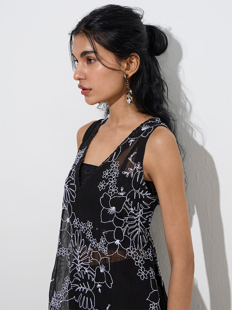 This black A-line kurta from Vark is designed with delicate white floral embroidery for an elegant contrast. Crafted from sumptuous mesh fabric. it features a flattering thread work-adorned V-neck and a sleeveless cut. offering a graceful and airy look perfect for festive and evening occasions.