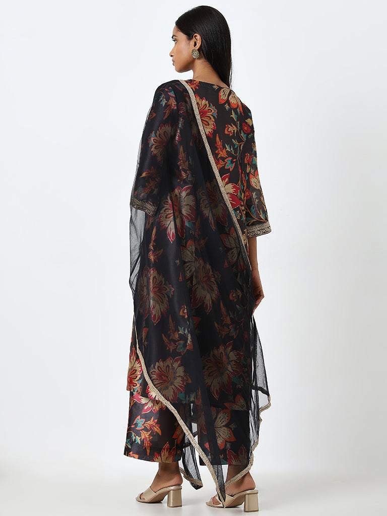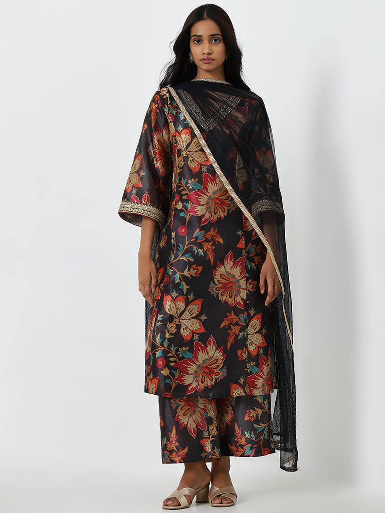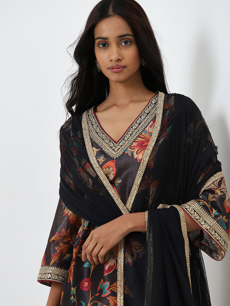 Vark Black Floral Printed A-Line Kurta. Palazzos and Dupatta Set