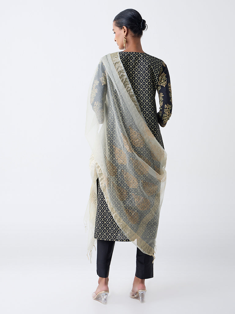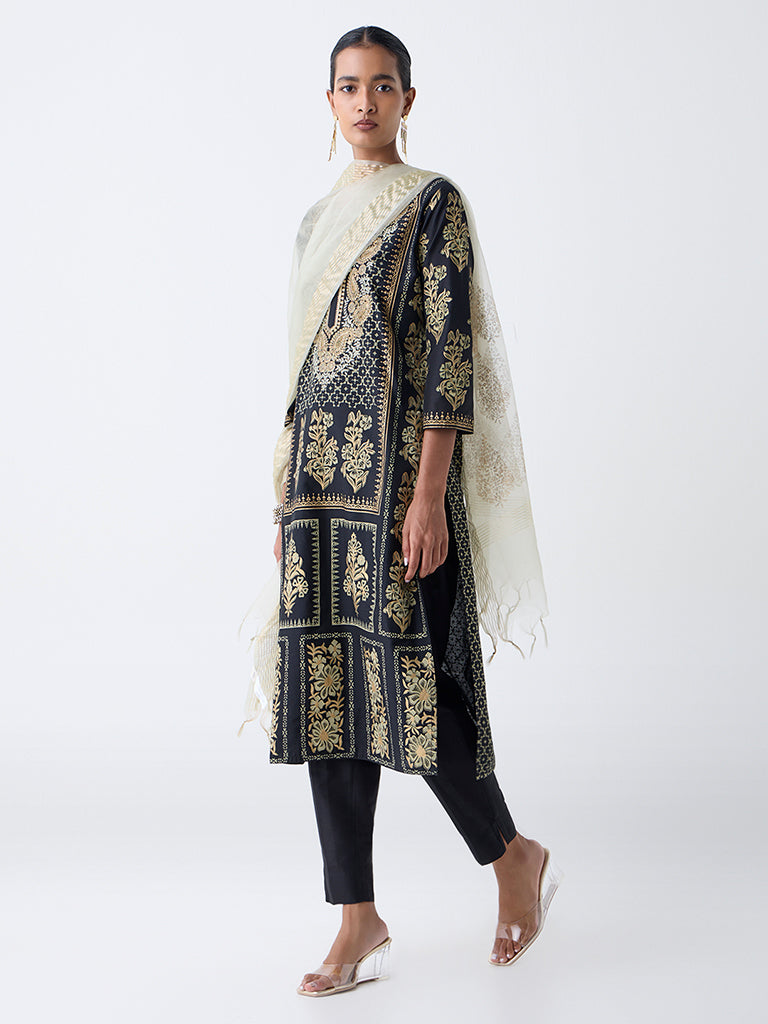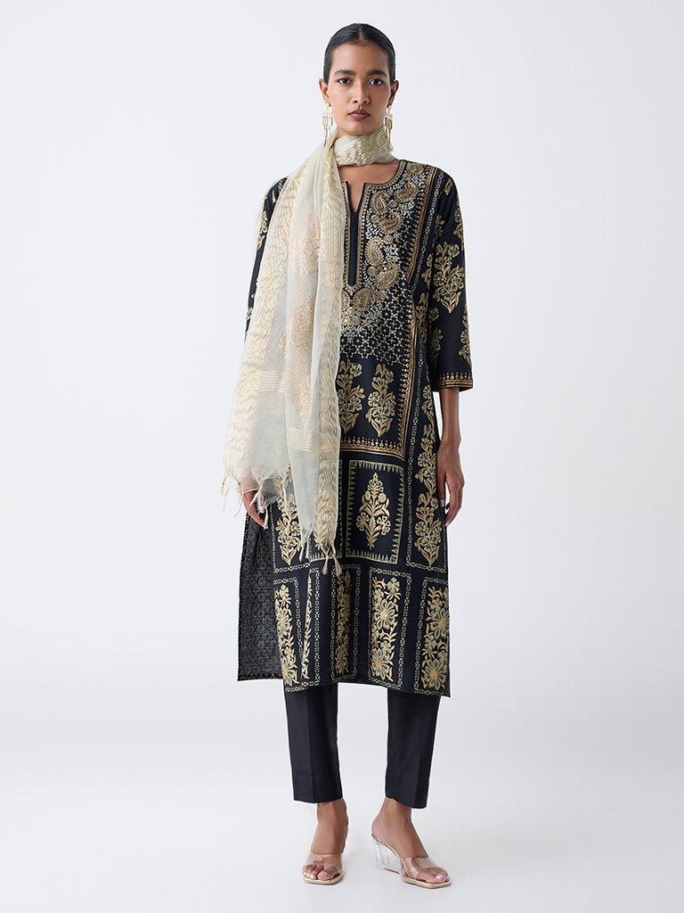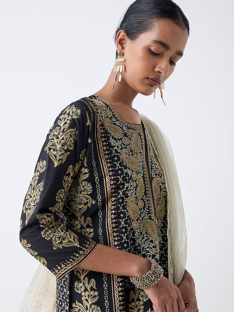 This black ethnic set by Vark blends timeless motifs with modern ease. The straight kurta showcases floral and paisley designs and is styled with a split neckline and three-quarter sleeves for everyday festive refinement. Matching pants with an elasticated waistband offer comfort. while the sheer dupatta completes the ensemble with an elevated touch.