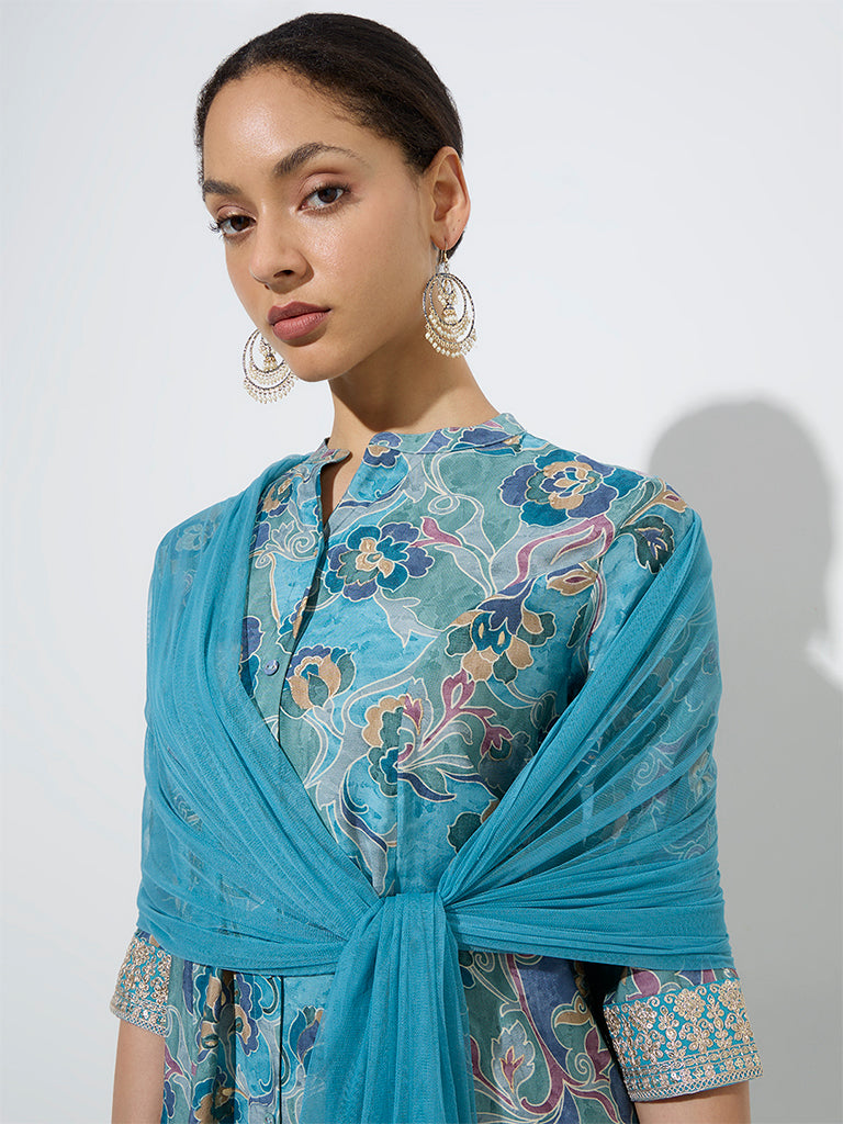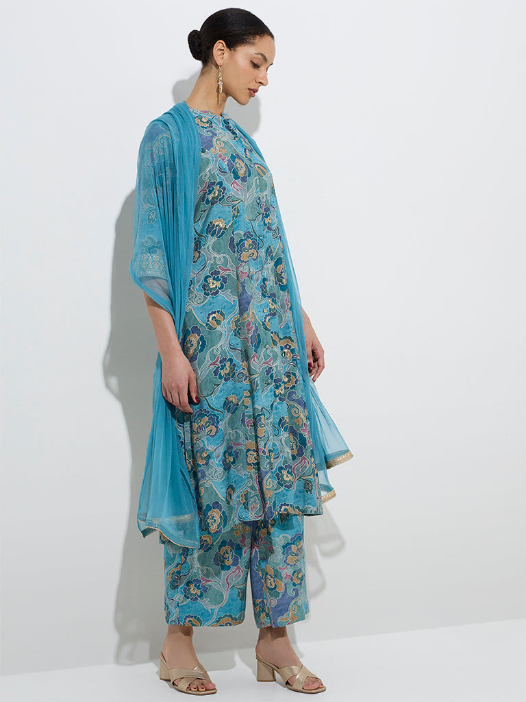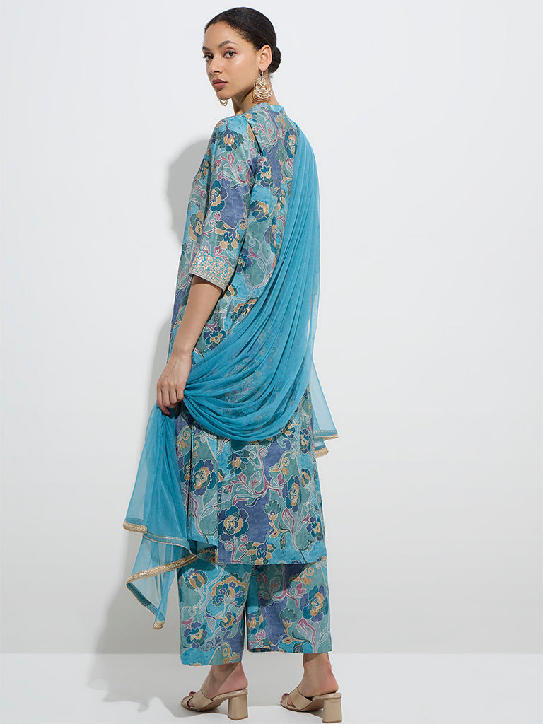 Vark Blue Botanical A-Line Kurta. Palazzos and Dupatta Set
