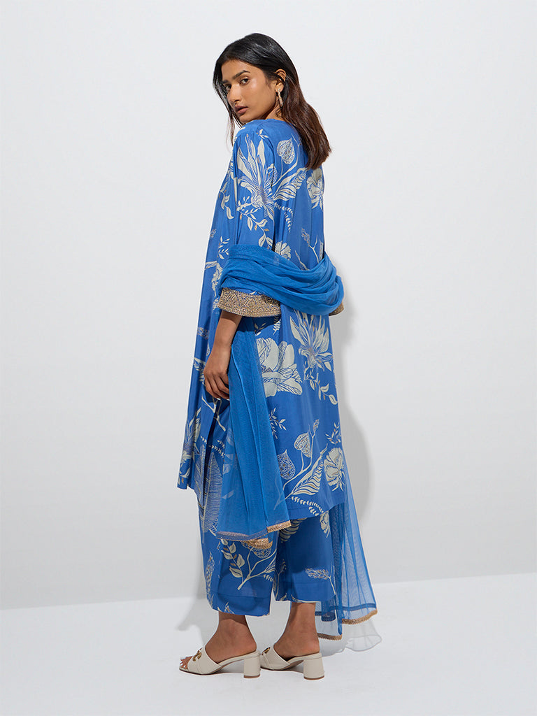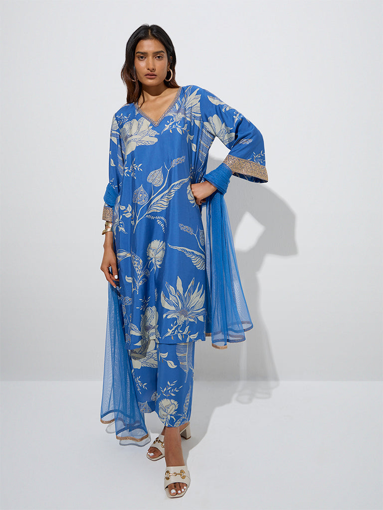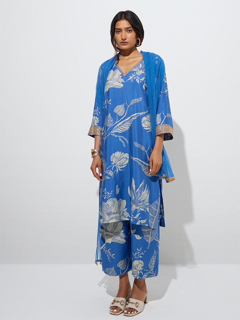 Vark Blue Botanical Straight Kurta. Palazzos and Dupatta Set