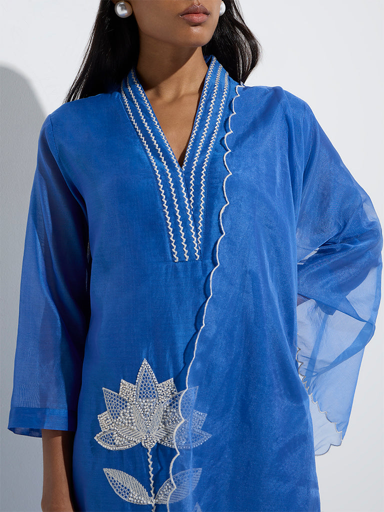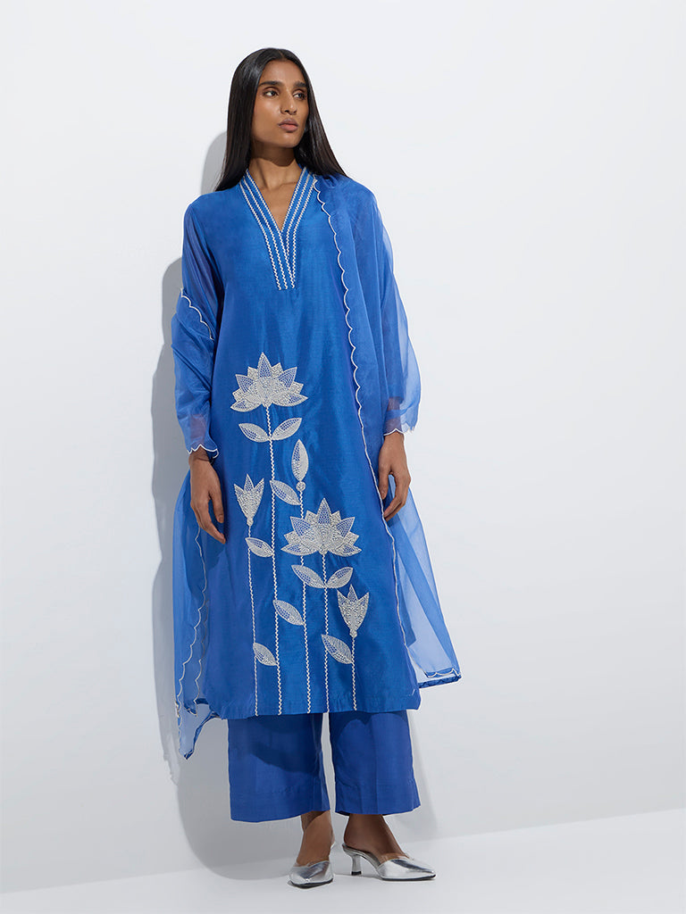 Vark launches this elegant blue ethnic set. perfect for festive occasions and special gatherings. The kurta is adorned with intricate floral embellishments and styled with a V-neck and three-quarter sleeves. It is paired with breezy palazzos featuring an elasticated waistband for all-day comfort. The look is completed with a sheer organza dupatta finished with a scalloped hem. adding a refined touch of charm to the ensemble.