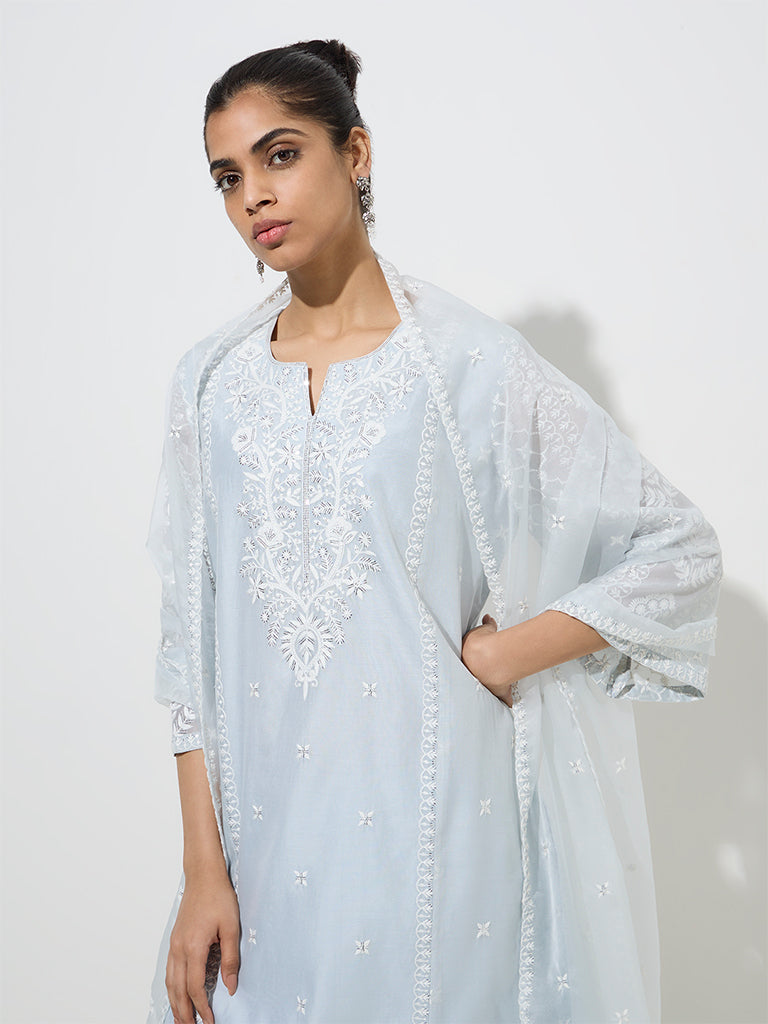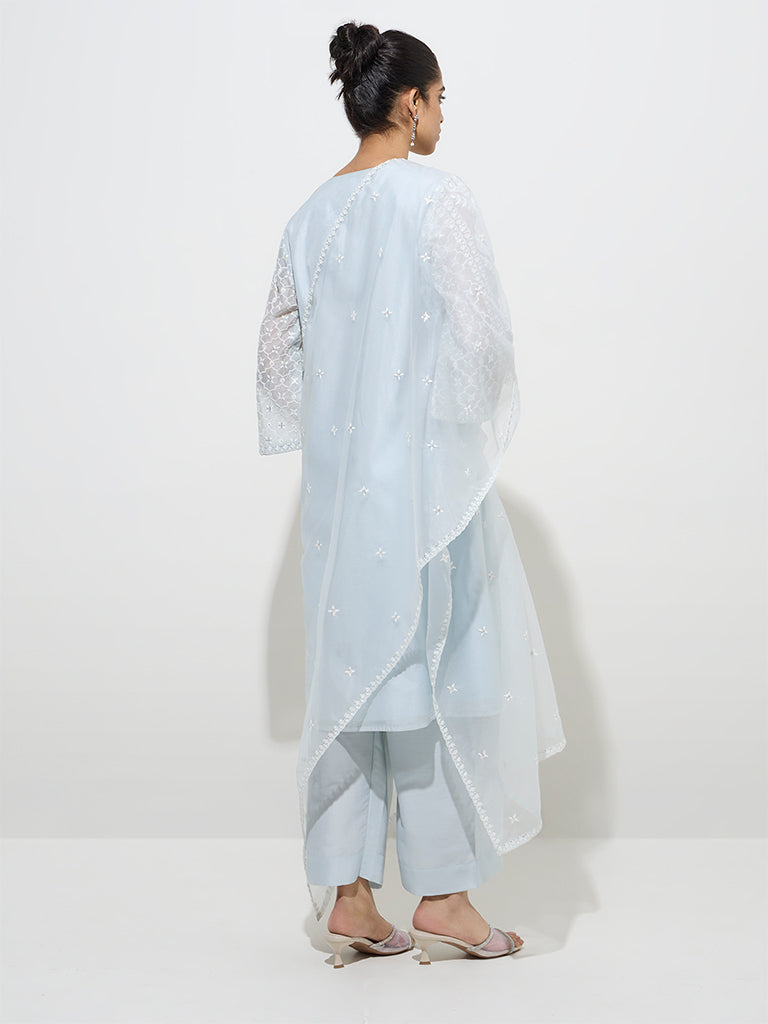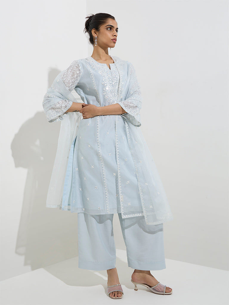 Vark Blue Cotton-Blend Kurta. Palazzos and Dupatta Set