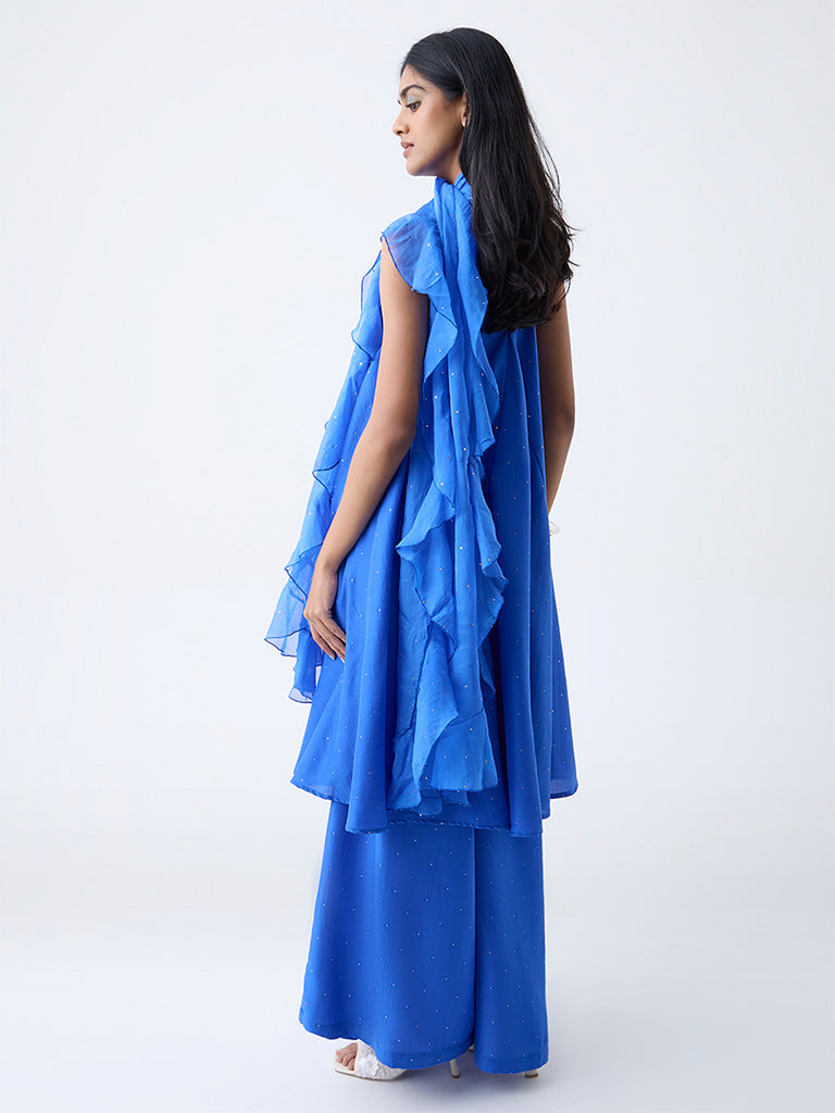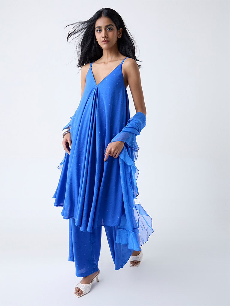 When festivities call for effortless glamour. reach for this blue ethnic set from Vark. The A-Line kurta is adorned with exquisite diamante embellishments and is finished with a plunge neck and sleeveless cut. Elasticated palazzos offer ease and movement. complemented by a ruffled dupatta that adds a hint of drama.