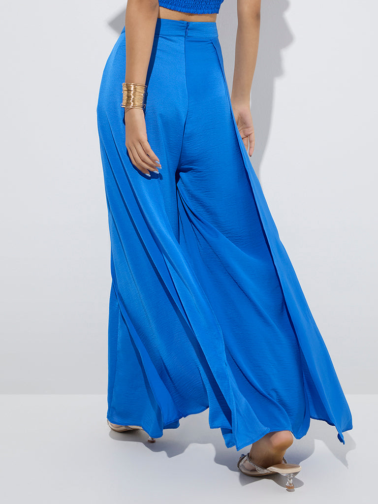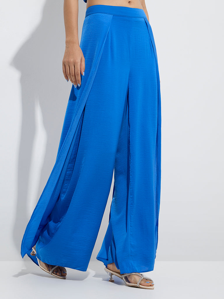 Make a fluid statement with these captivating blue palazzos from Vark. Their stylish wrap-over design creates stunning volume and movement. while the ultra-lightweight fabric ensures luxurious comfort. Designed with an elastic waistband and convenient side pockets. these palazzos blend sophisticated style with everyday practicality.