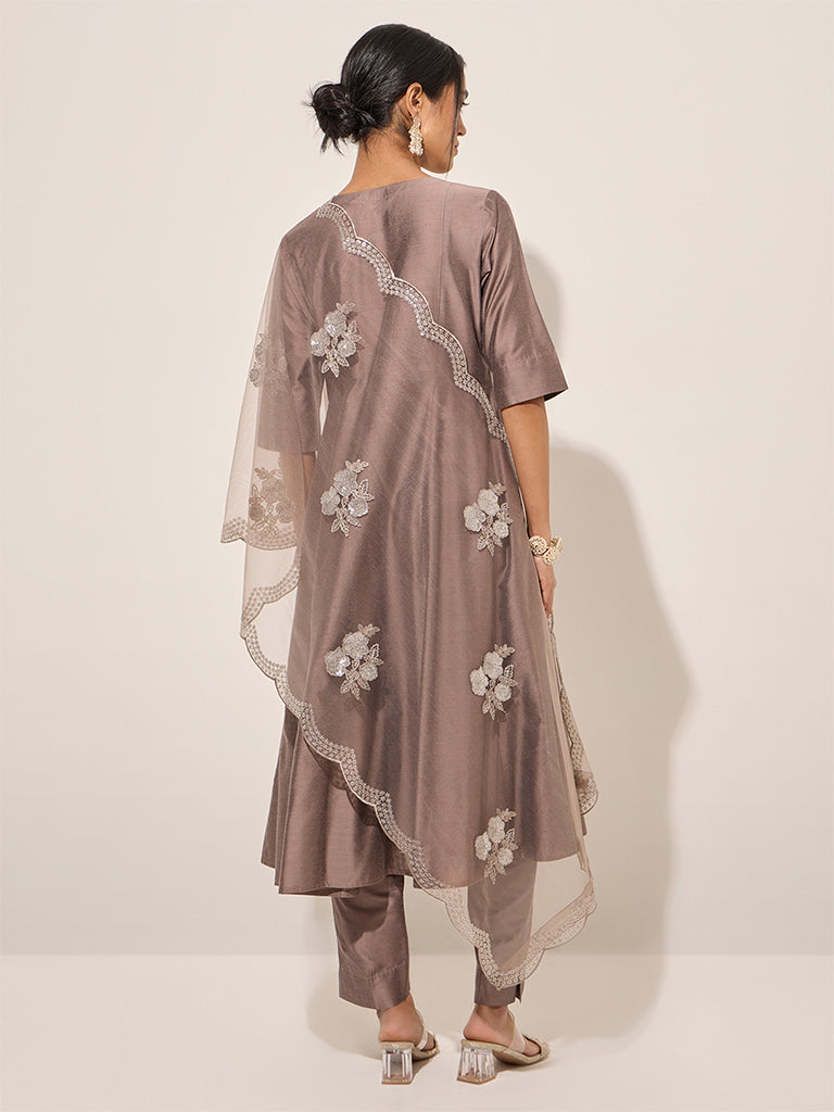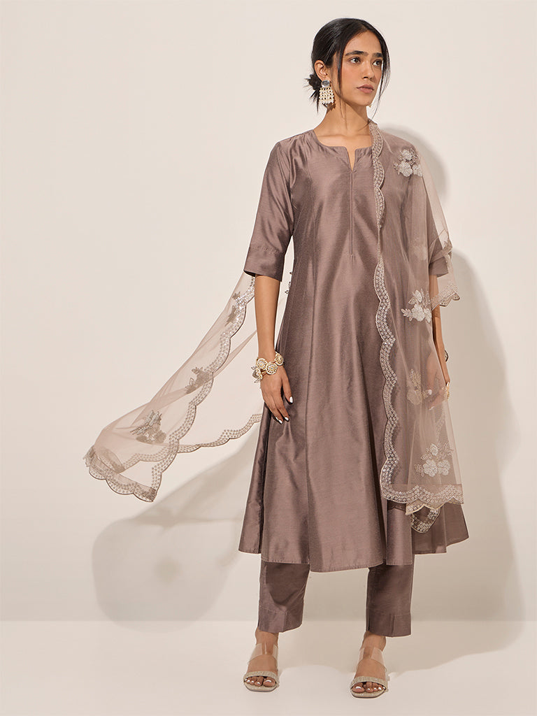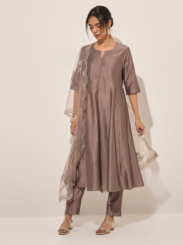 Vark Brown A-Line Kurta. Ethnic Pants and Dupatta Set