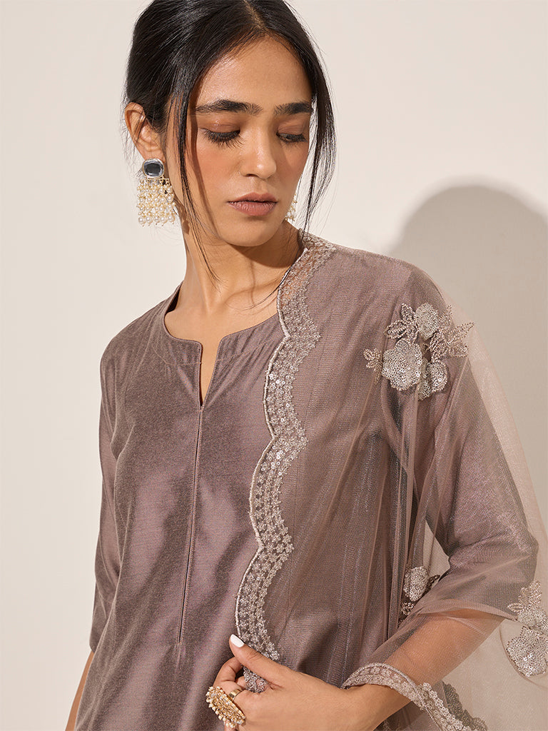 Vark presents this festive-ready brown embellished set. crafted from premium fabric for timeless charm. The A-line kurta is designed with delicate pleats. a split neckline. and three-quarter sleeves. creating an elegant and structured silhouette. It is paired with high-rise pants and a net dupatta. adorned with a scalloped hemline and intricate embellishments.