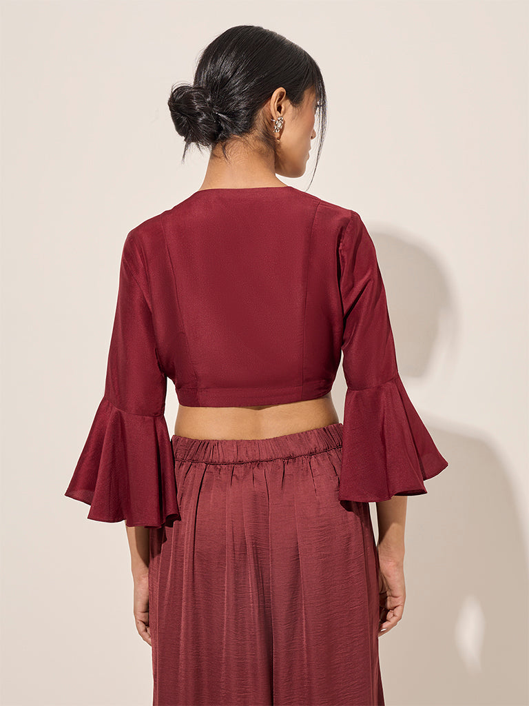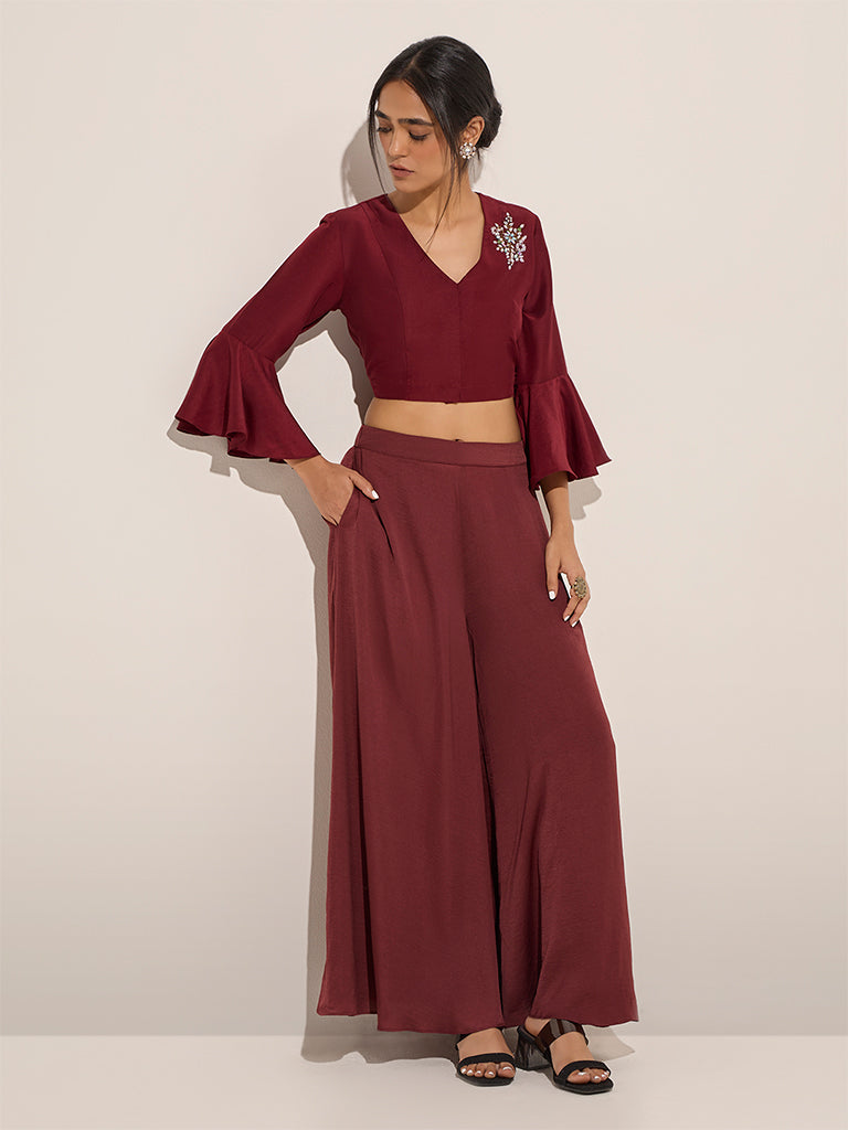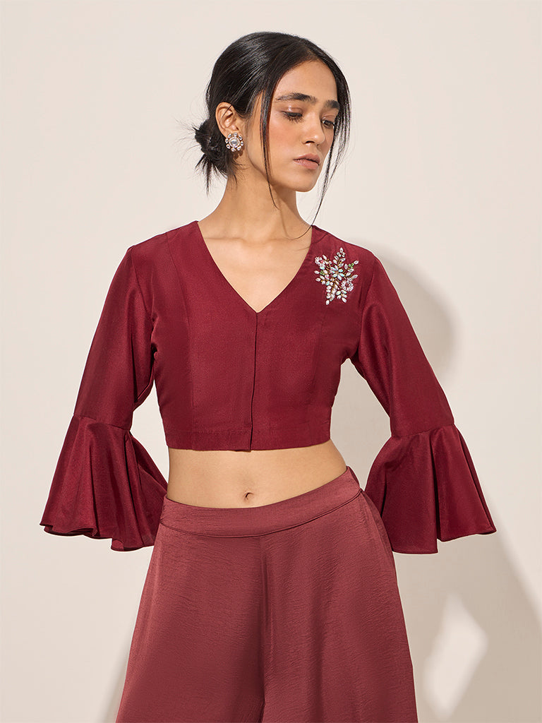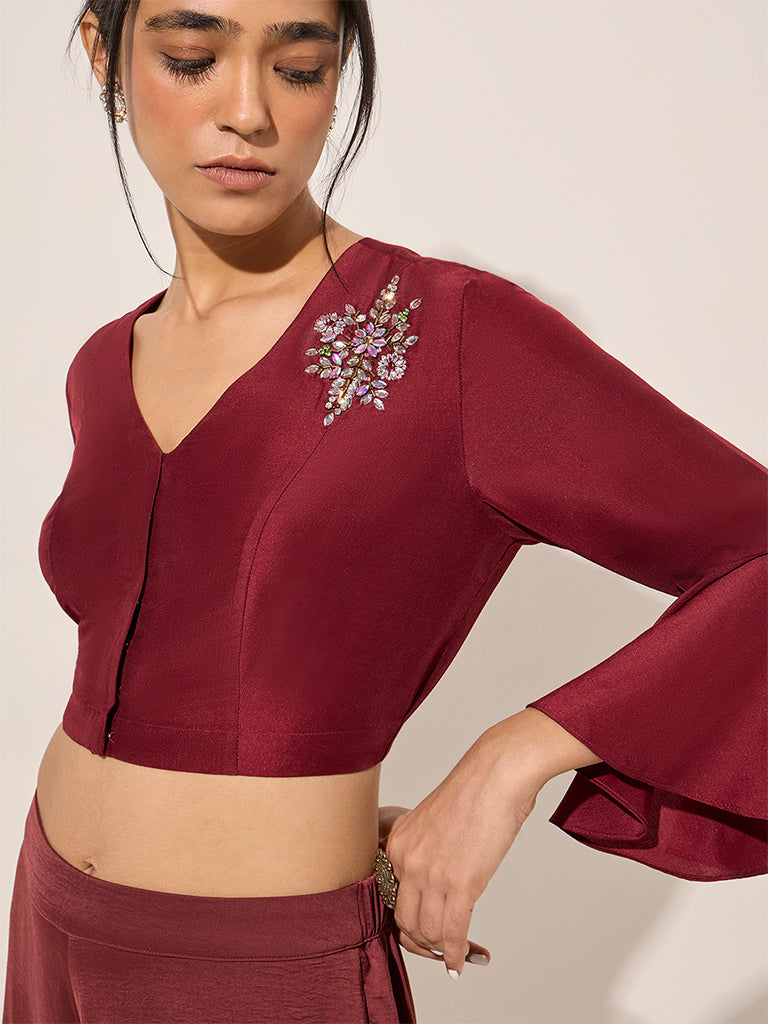 This burgundy blouse by Vark is elevated with floral embellishments. Made from quality fabric. it boasts a V-neck leading to a button down placket and graceful bell sleeves.