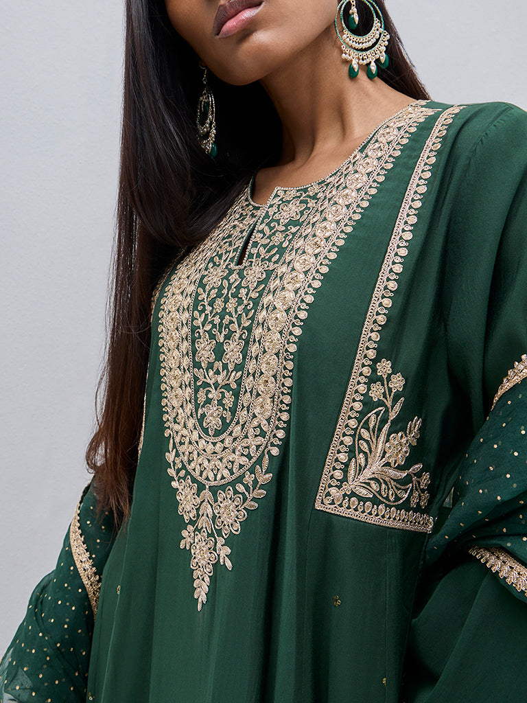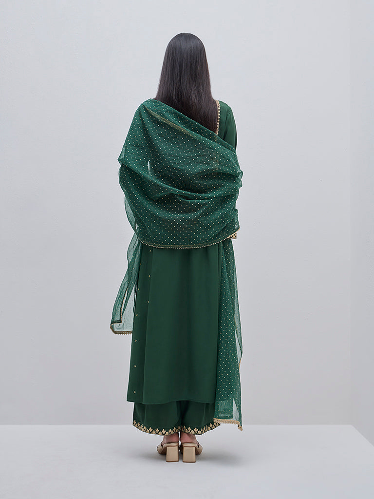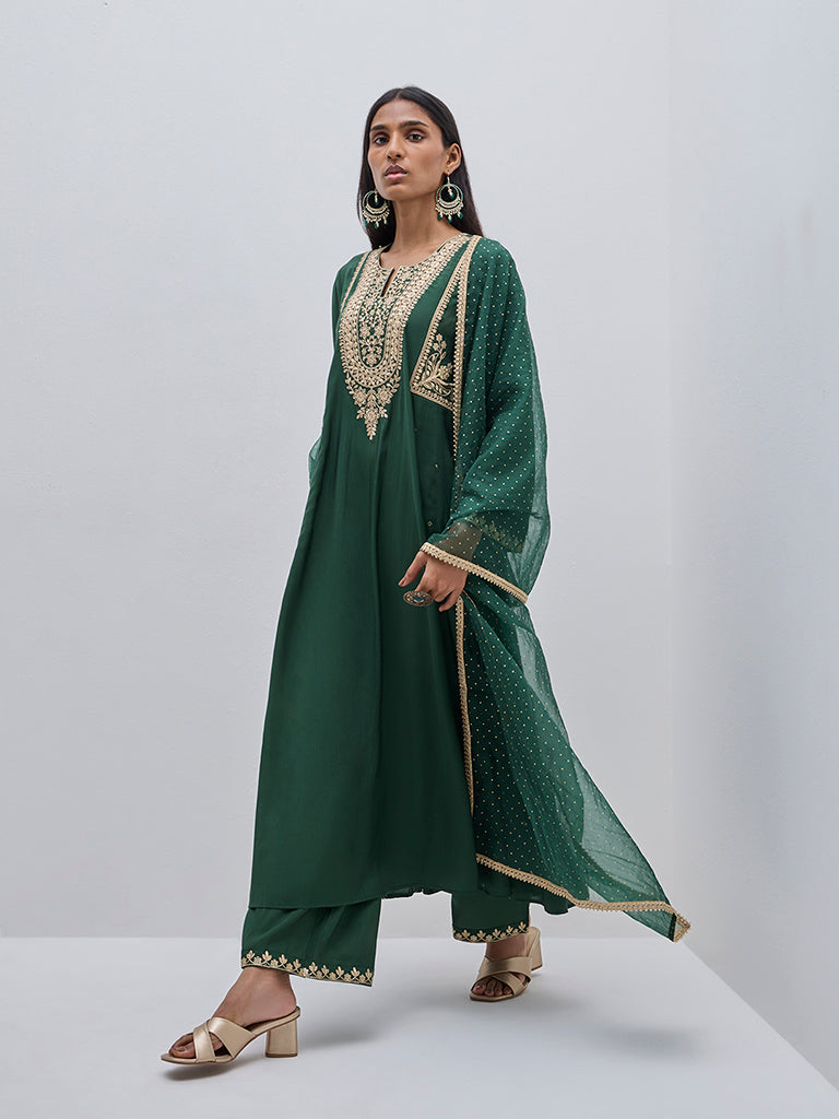 Vark Dark Green Embroidered Kurta. Palazzos & Dupatta Set