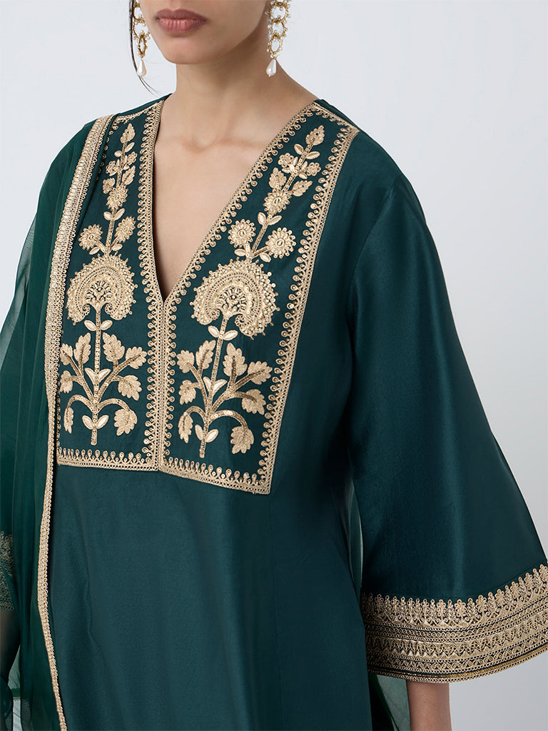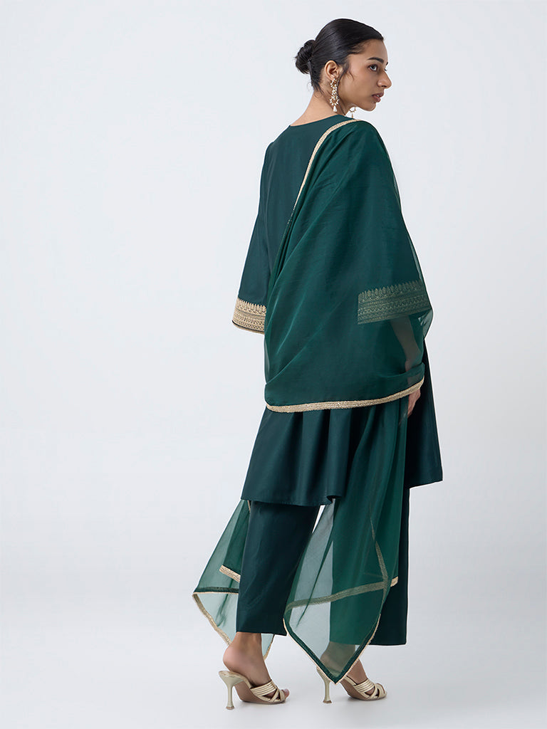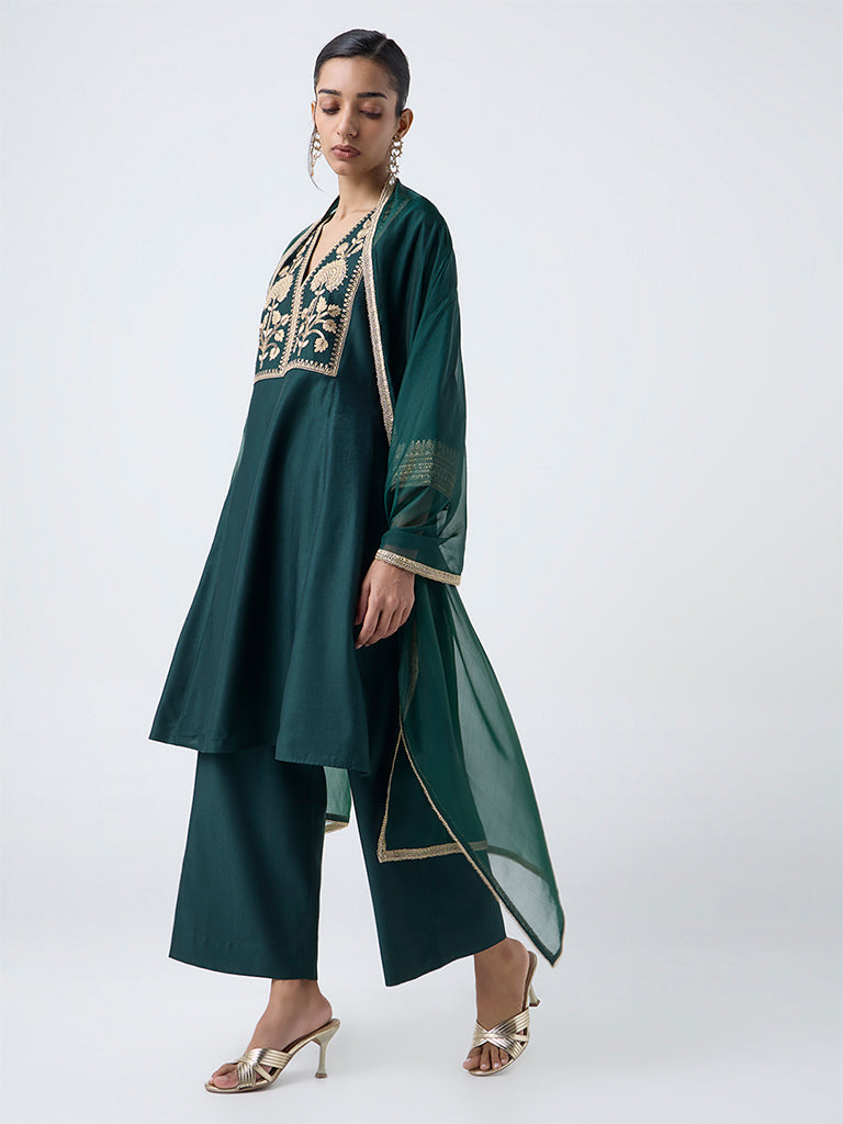 Steeped in festive elegance. this dark green ethnic set from Vark is crafted from high-quality fabric that flows beautifully. The A-line kurta stands out with Garwal-inspired embroidery on the yoke. framed by a V-neck and flared sleeves for added grace. Coordinated palazzos with an elasticated waistband ensure comfort. while the sheer net dupatta with a zari trim lends a refined finishing touch.