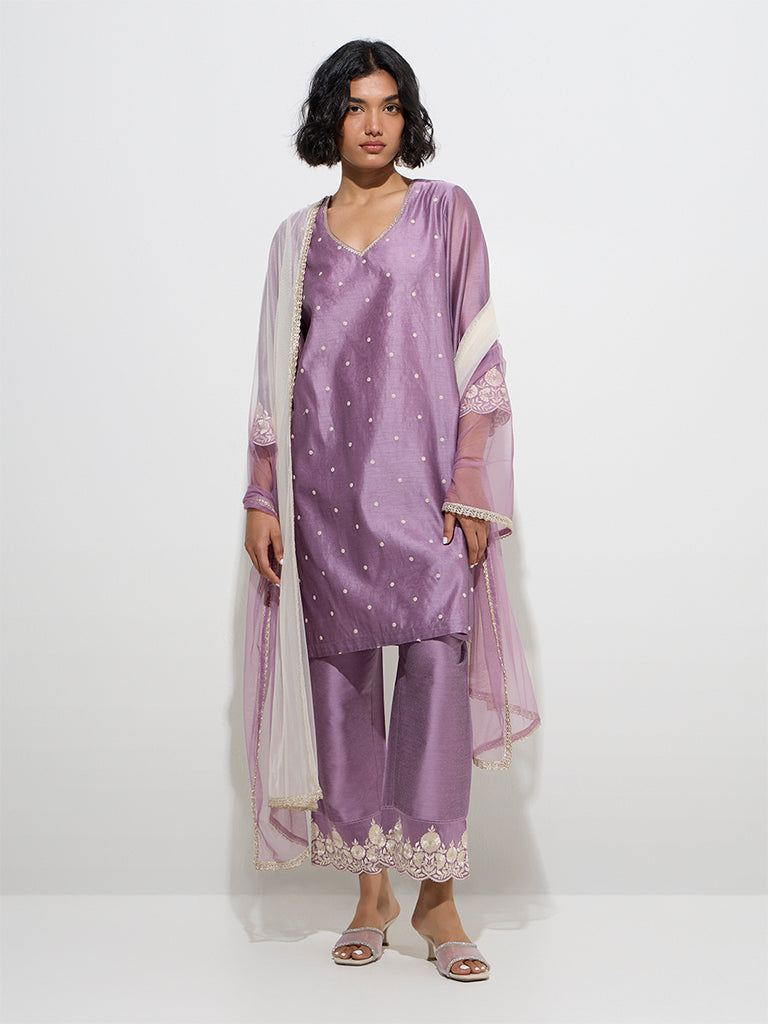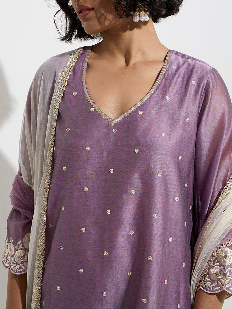 This dark mauve ethnic set from Vark blends timeless charm with refined craftsmanship. The A-line kurti is elevated with intricate floral embroidery. a flattering V-neckline. and flared sleeves finished with scalloped hems for a feminine flourish. Paired with matching ethnic pants featuring an elasticated drawstring waistband. the set is completed with an ombré net dupatta adorned with delicate zari trims—bringing a graceful finish to the ensemble.