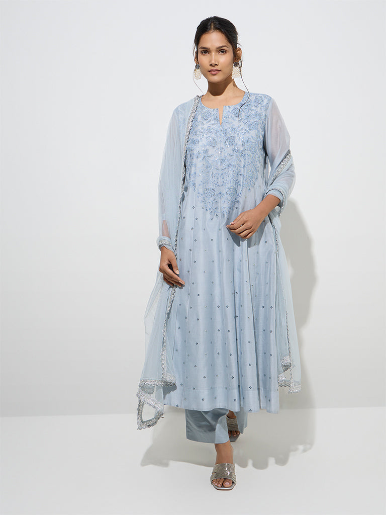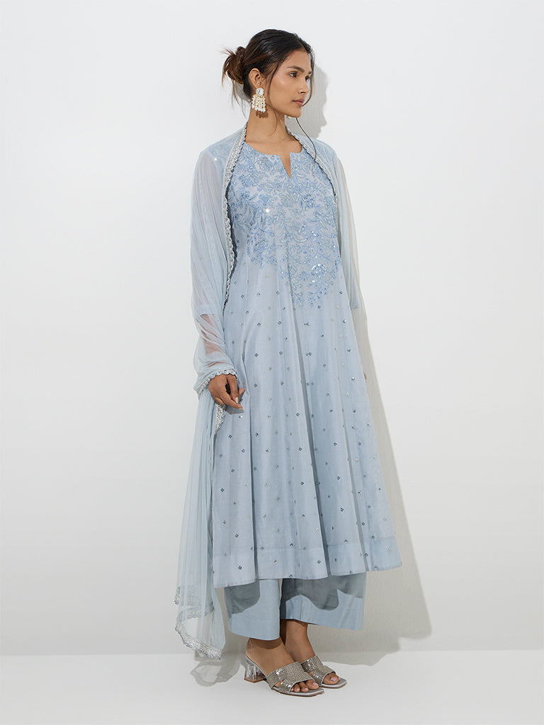 Vark Dusty Blue Cotton-Blend Fit-and-Flare Kurta. Pants and Dupatta Set