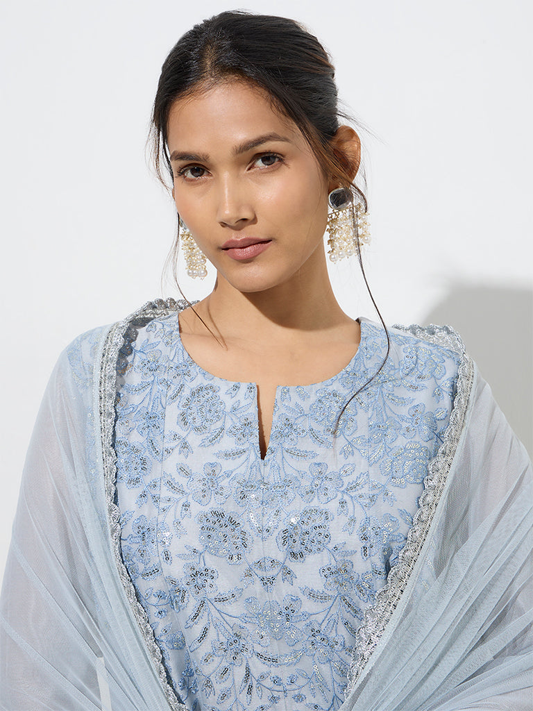 Vark presents this dusty blue ethnic set. beautifully woven from a sumptuous cotton-blend fabric. Designed in a flattering fit-and-flare silhouette. the kurta showcases intricate floral embroidery with sequin detailing. complemented by a split neckline and three-quarter sleeves. Paired with matching ethnic pants. the ensemble is elegantly completed with a coordinating dupatta for a refined finish.
