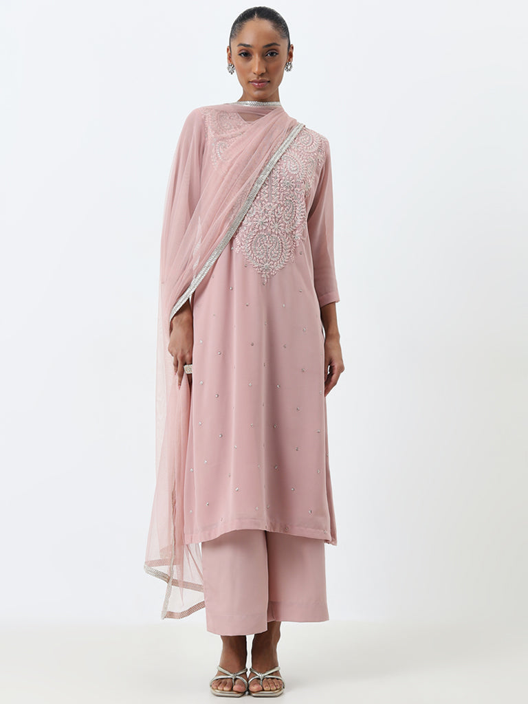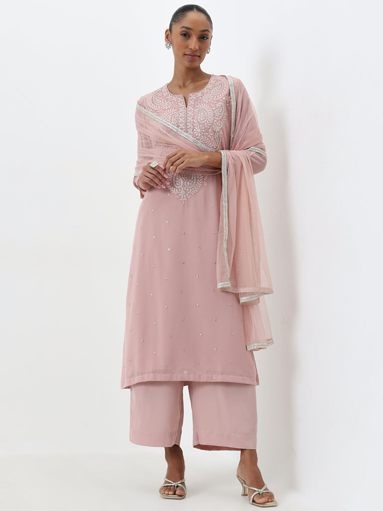 This dusty pink set by Vark includes a kurta. ethnic pants. and dupatta. The A-Line kurta is decorated with paisley embroidery at the yoke and comes finished with a split neckline and three-quarter sleeves. The set is complete with a pair of matching pants and net dupatta.
