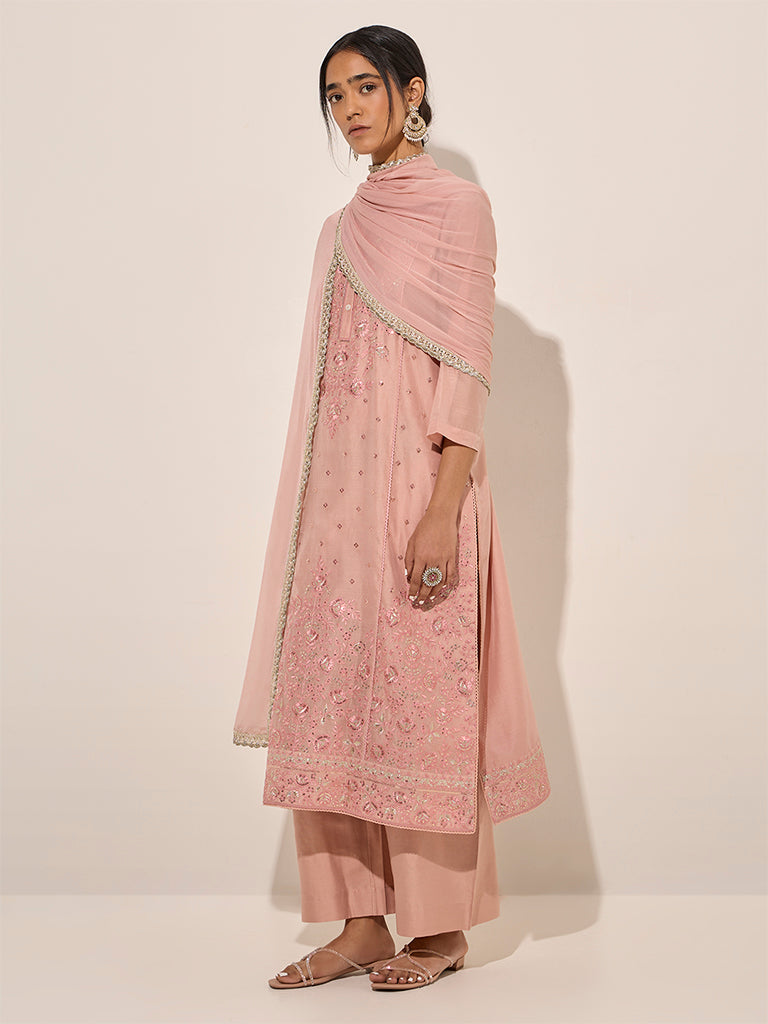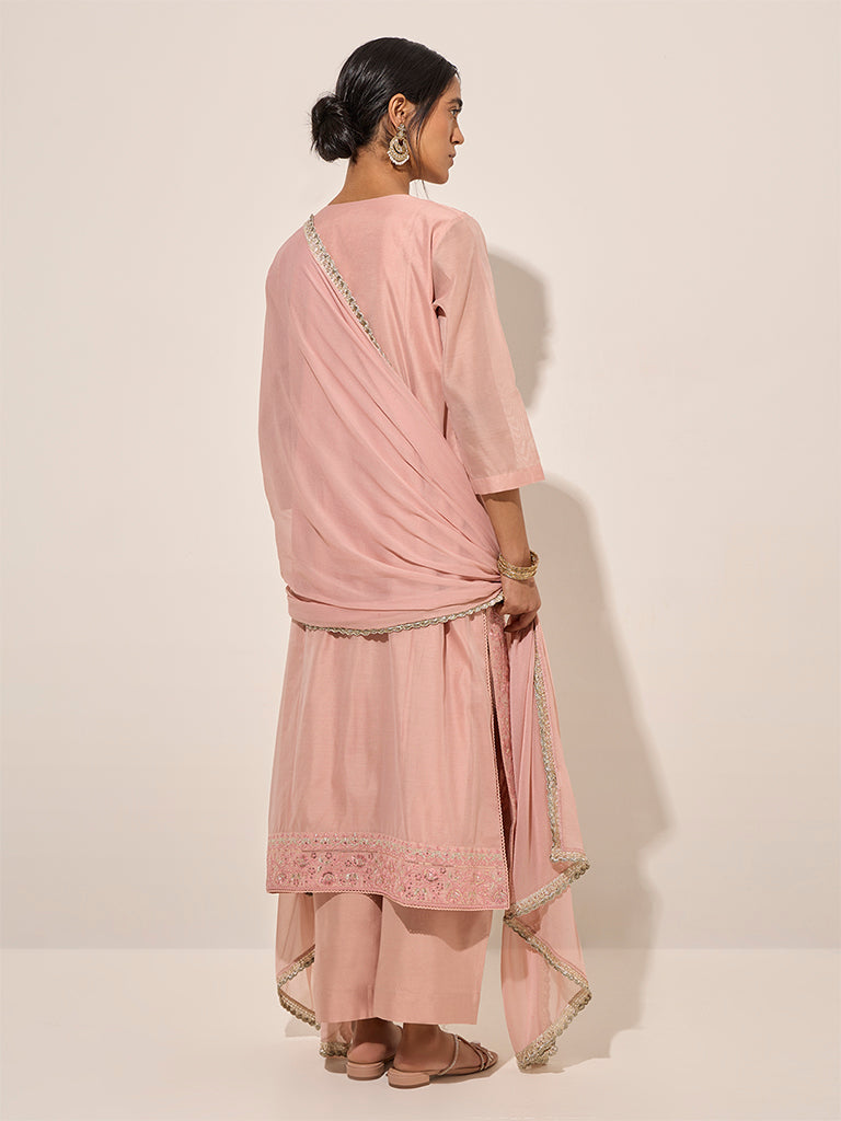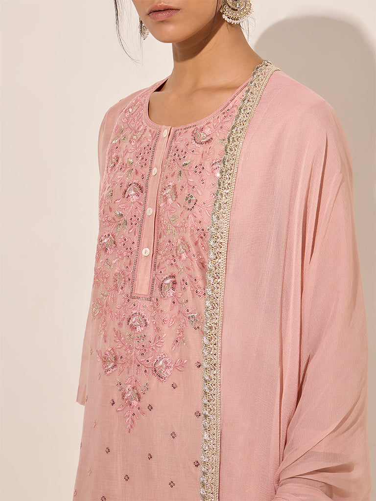 Vark presents this festive-ready dusty pink kurta set in premium fabric build The A-line kurta is adorned with delicate floral embellishments and features a round neck. button-down detailing. and three-fourth sleeves. It is paired with high-rise pants with a smooth elastic waistband and a solid dupatta highlighted by a zari-embroidered border.