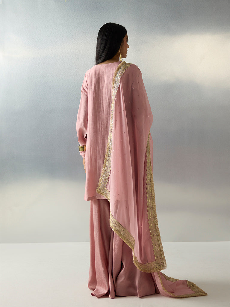 This dusty pink ethnic set from Vark is crafted with details that make festive dressing easy yet elegant. The embroidered kurta with its simple neckline and full sleeves sets a graceful tone. while the flowing sharara adds a touch of drama without compromising comfort. Finished with a zari-edged dupatta tipped in fringe. the ensemble carries a festive charm that suits both intimate and grand celebrations.