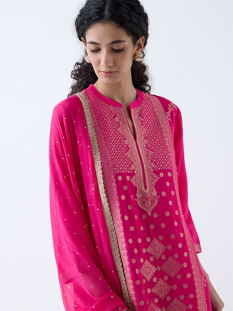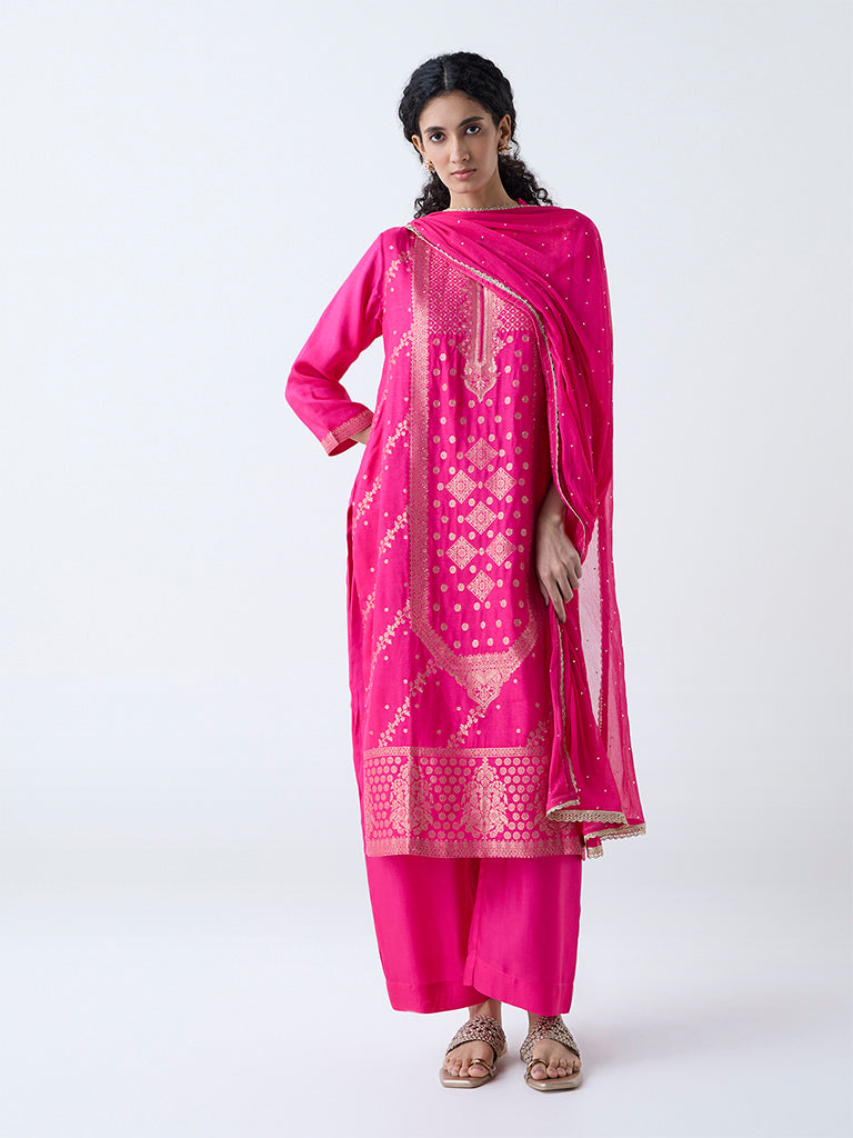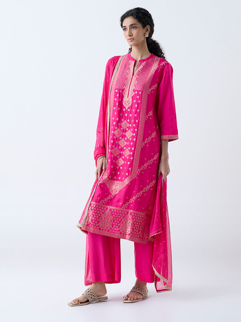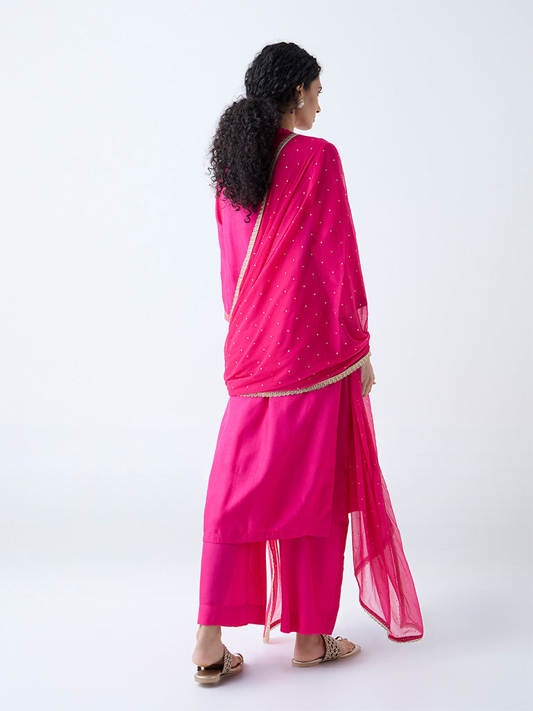 This fuchsia ethnic set from Vark showcases graceful embroidery that adds a vibrant charm to your festival edit. The straight-cut kurta is designed with a split neck and three-quarter sleeves for an elegant silhouette. Paired with coordinated palazzos featuring an elasticated waistband for day-long comfort. the look is completed with a soft dupatta finished with zari trims.