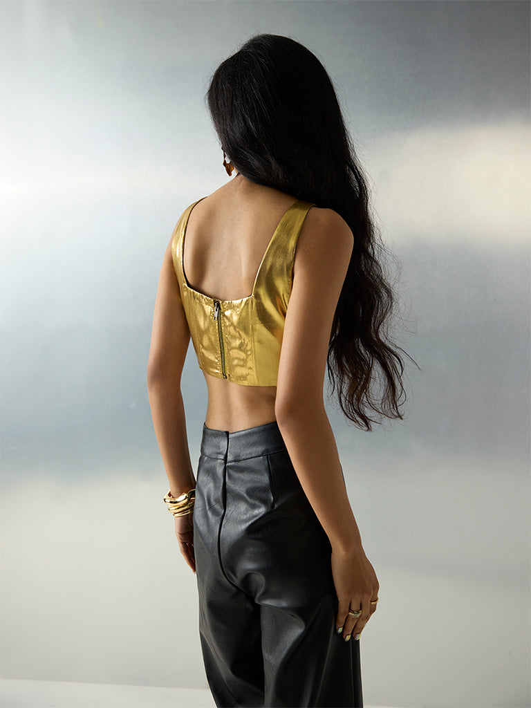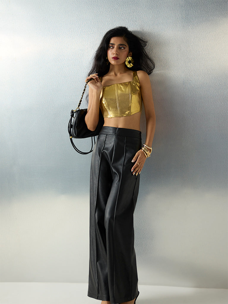 This gold corset top by Vark is made for those moments when you want a polished festive look with minimal effort. The square neckline and sleeveless cut create a modern profile. while the smocked back ensures it fits like a dream.