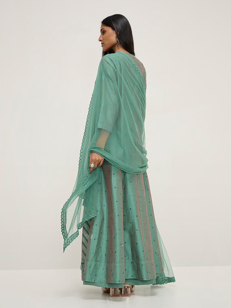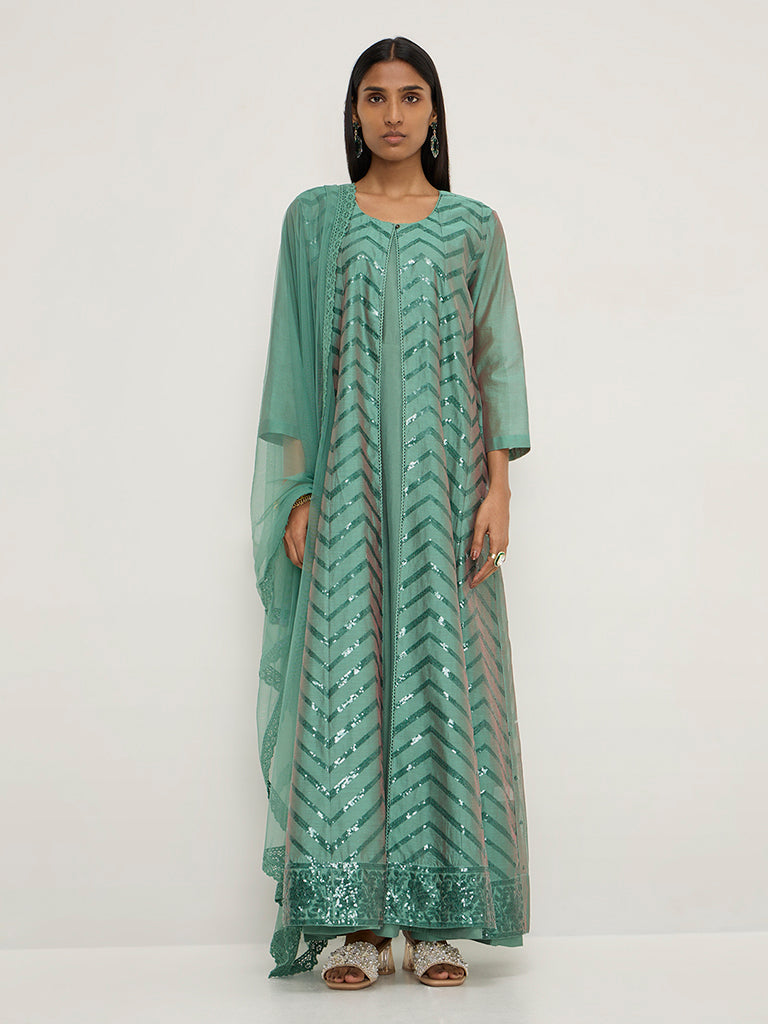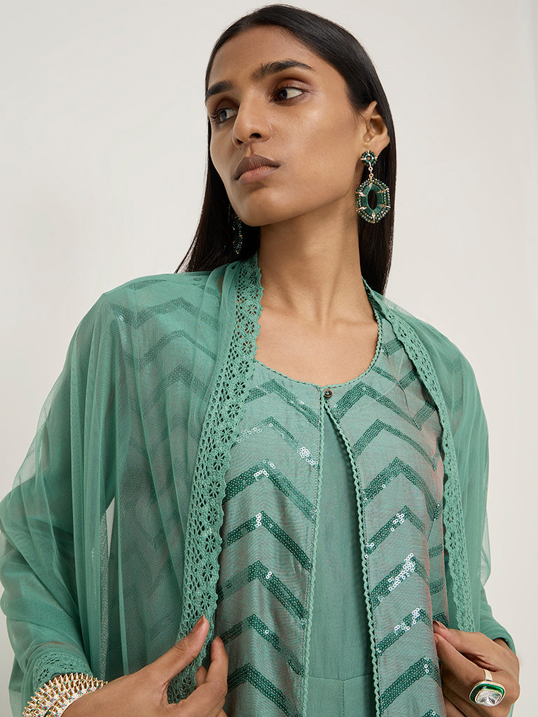 Vark Green Embellished Cotton-Blend Kurta. Inner. Pants and Dupatta Set