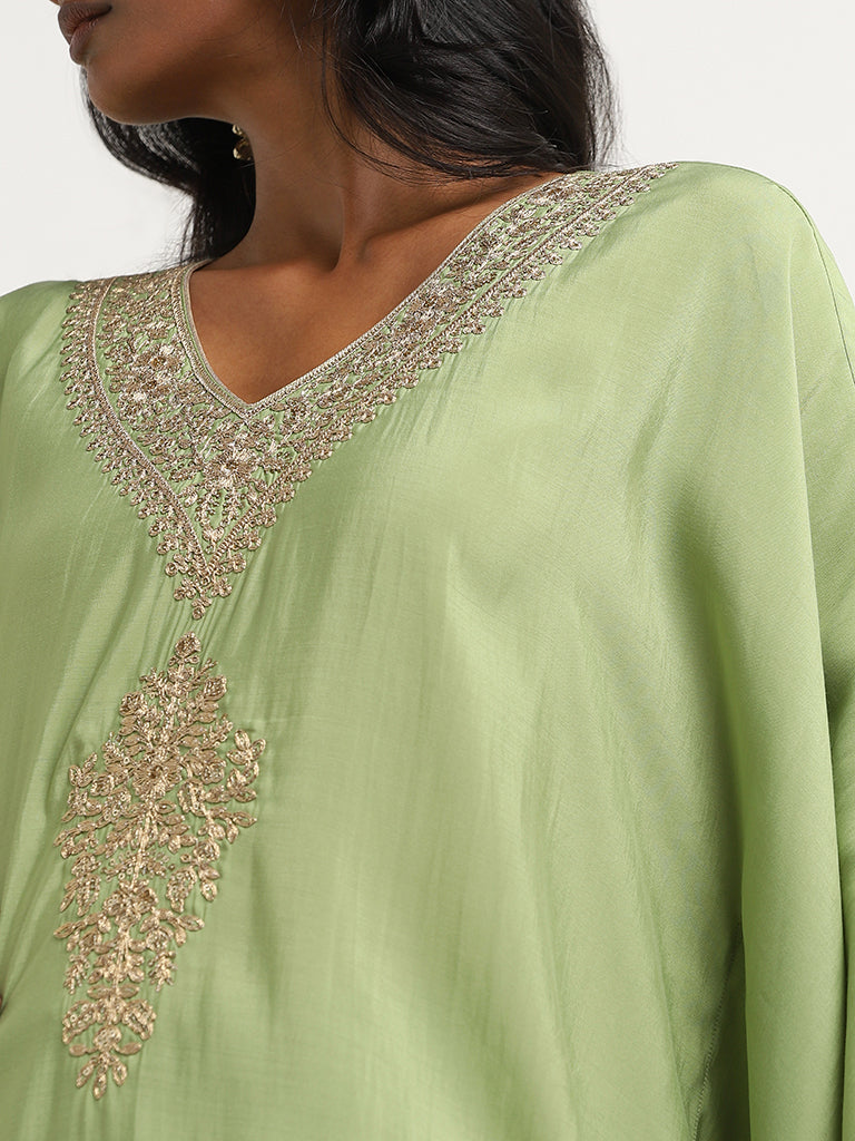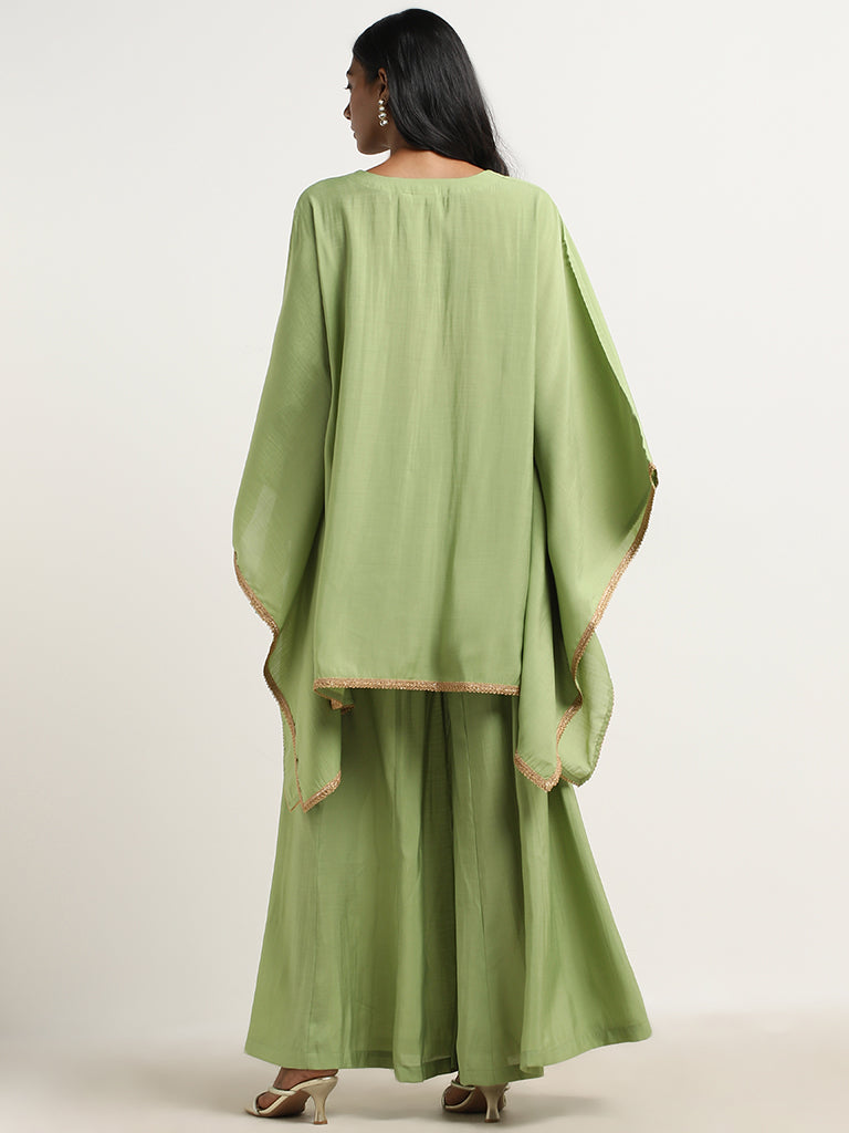 Vark Green Embellished Kaftan with Mid-Rise Palazzos Set