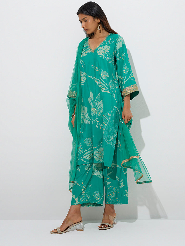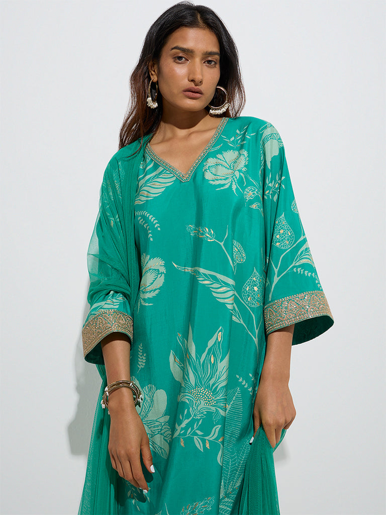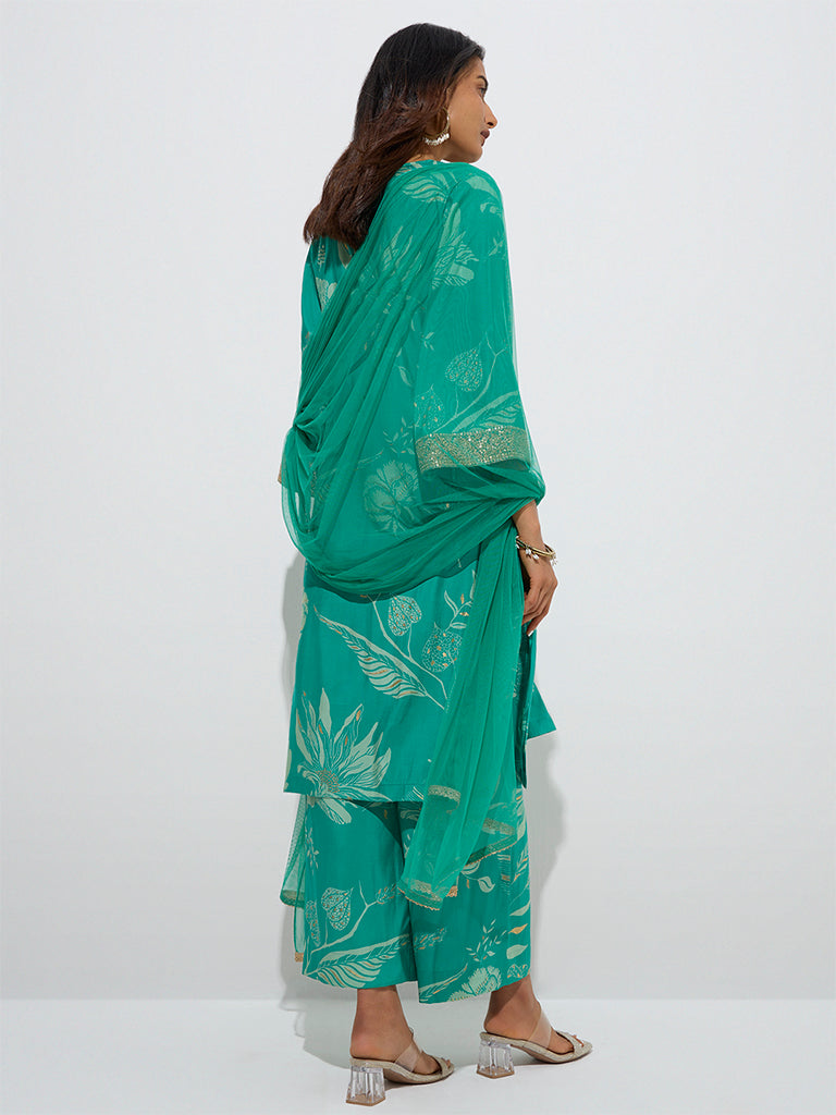 This green ethnic set from Vark exudes understated elegance with its serene hue and intricate design. The kurta is adorned with botanical motifs and features a V-neck and flared sleeves. delicately embellished with zari trims for a refined touch. Paired with coordinating palazzos that offer an elasticated waistband. the set is completed with a net dupatta.