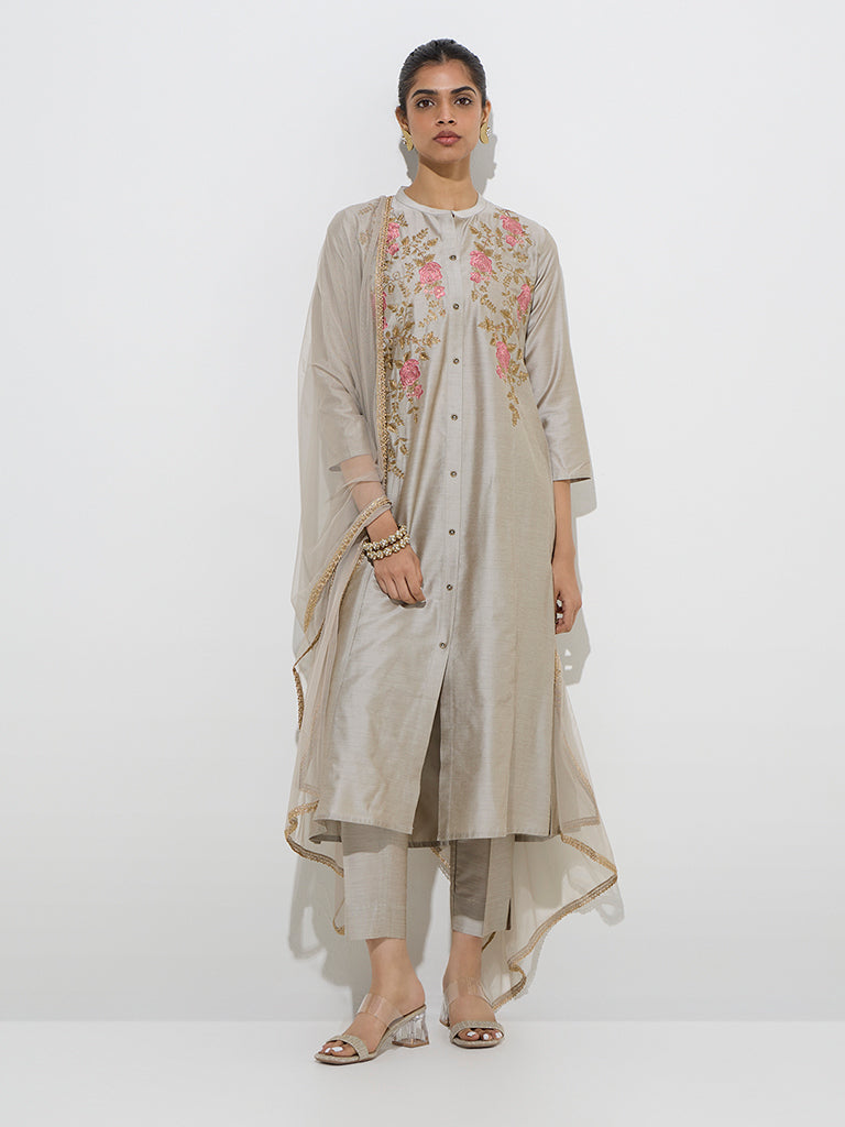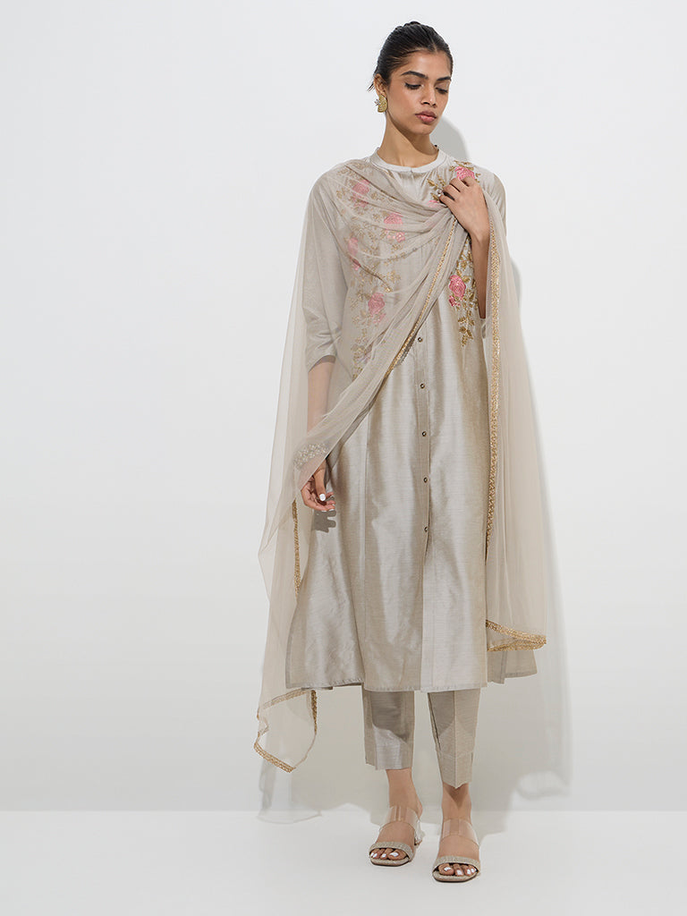 Vark Grey Floral A-Line Kurta. Ethnic Pants and Dupatta Set