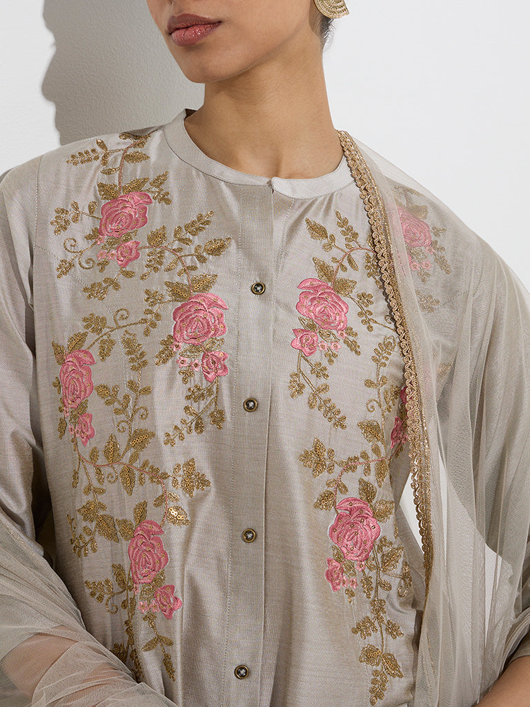 This grey ethnic set from Vark showcases floral embroidery for an elegant touch. The A-line kurta is designed with a band neck. a button-up front. and three-quarter sleeves. It is paired with matching ethnic pants featuring an elasticized waistband for a comfortable fit. Completing the ensemble is a delicate net dupatta. accented with exquisite zari trims for a refined finish.
