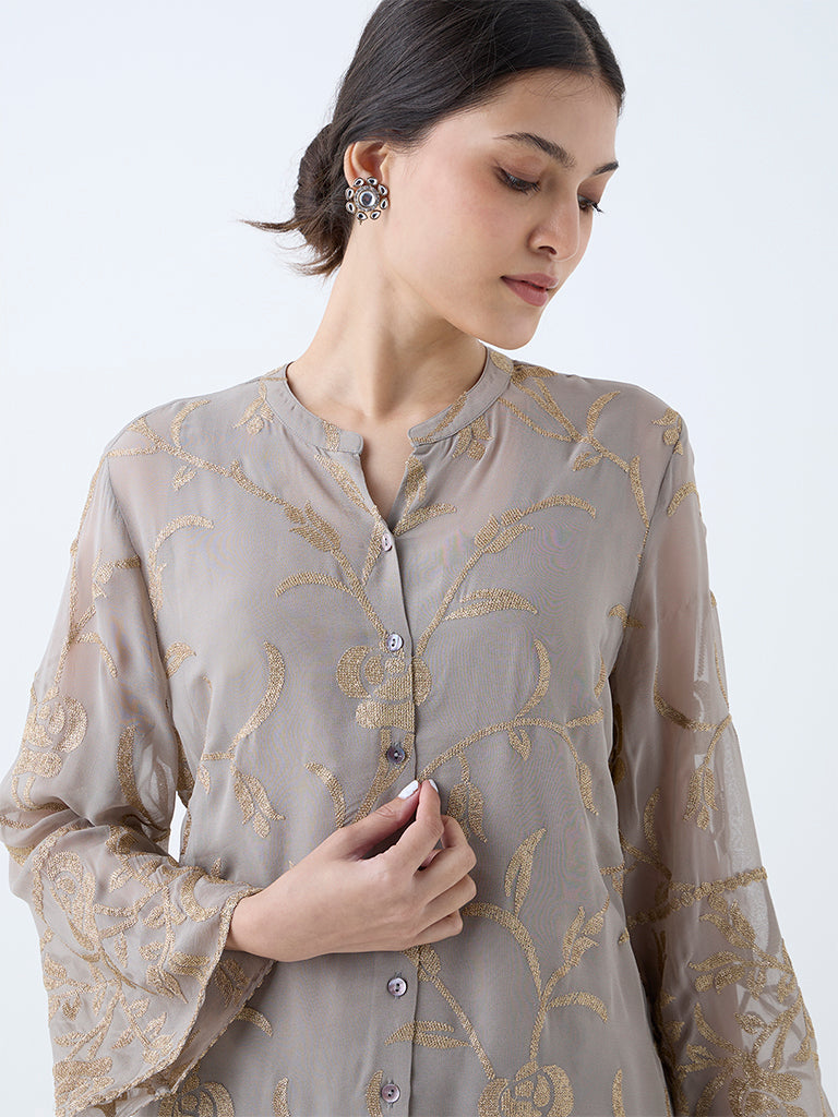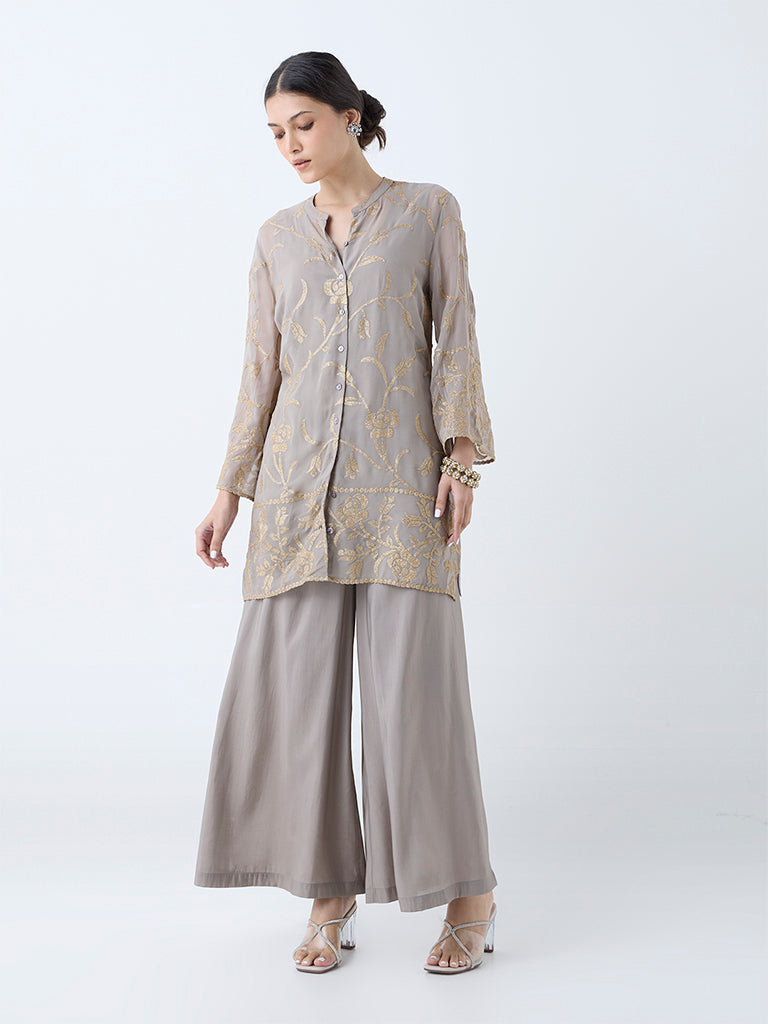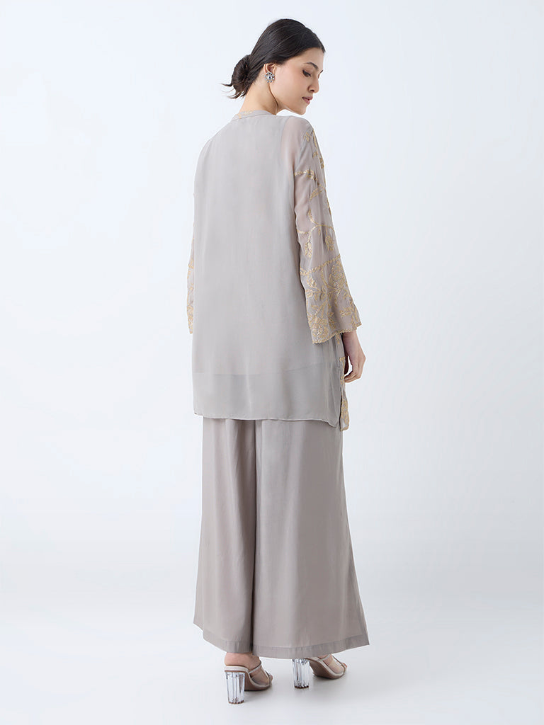 Vark reimagines festive elegance with this grey three-piece set. anchored by a sheer kurti intricately embroidered with gold-toned florals. The mandarin neck and full sleeves lend a graceful frame. while a discreet side pocket adds functional charm. Layered over a tonal inner for a secure finish. the kurti is paired with fluid palazzos featuring an elasticated waistband for a personalised fit.
