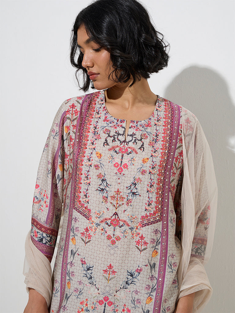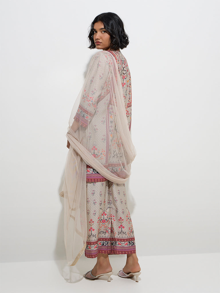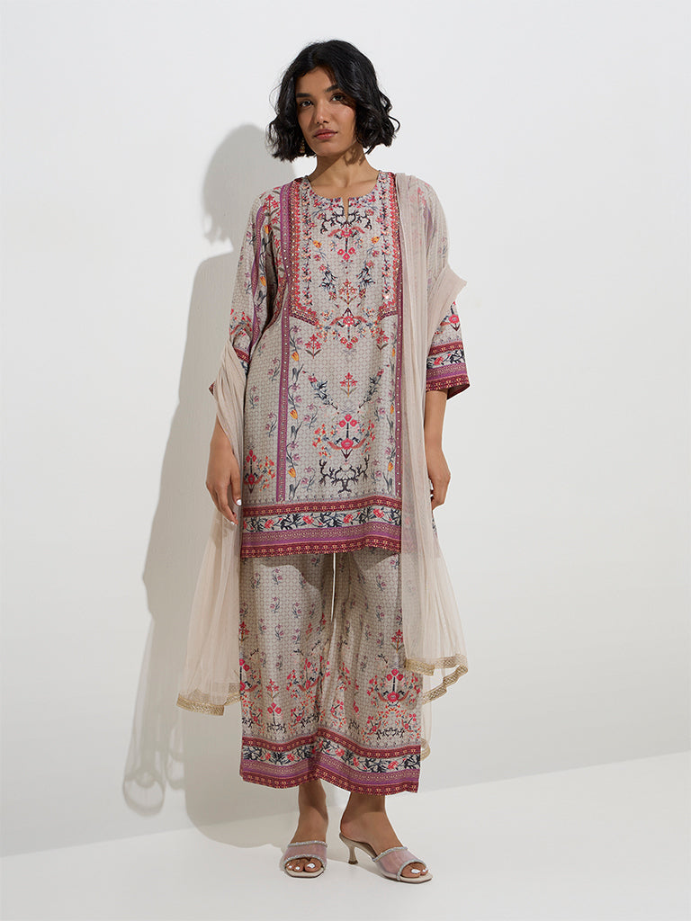 Vark Grey Floral Straight Kurti. Palazzos and Dupatta Set