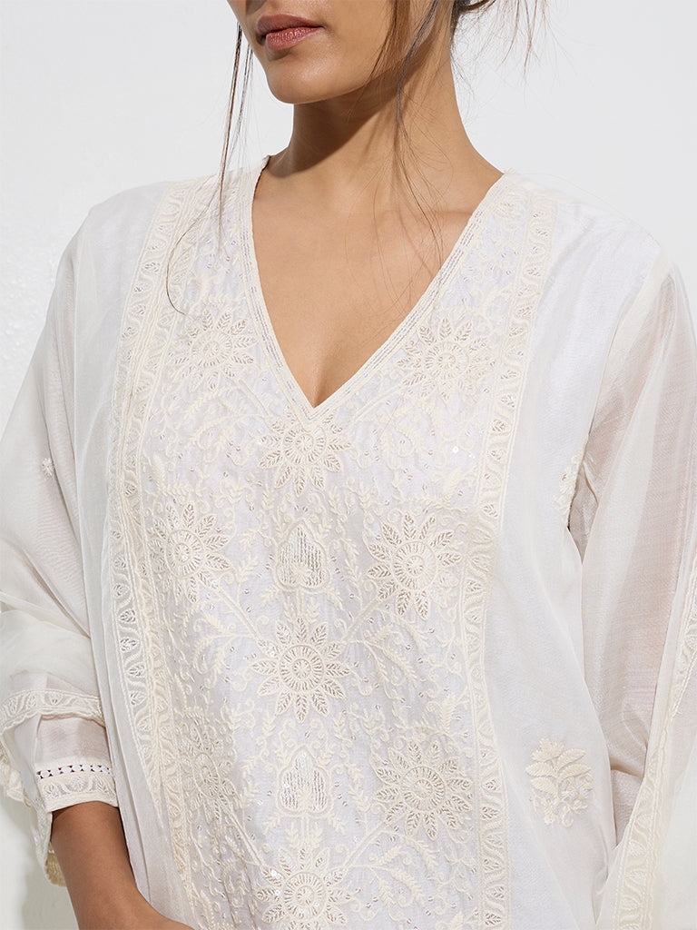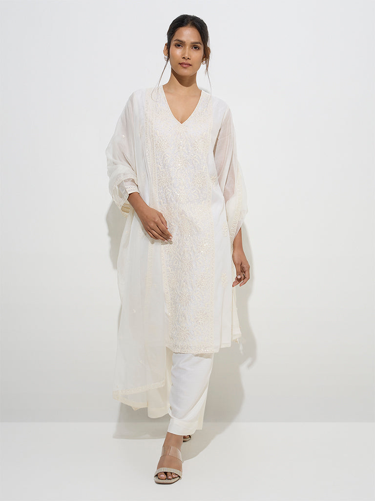 Vark introduces this ivory ethnic set. woven from cotton-blend fabric. The A-line kurta features intricate floral embroidery. a V-neck and three-quarter sleeves. Paired with mid-rise palazzos designed with a smooth elastic waistband. the set is completed with a matching dupatta featuring an embroidered hemline.