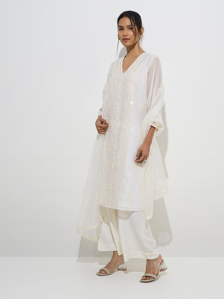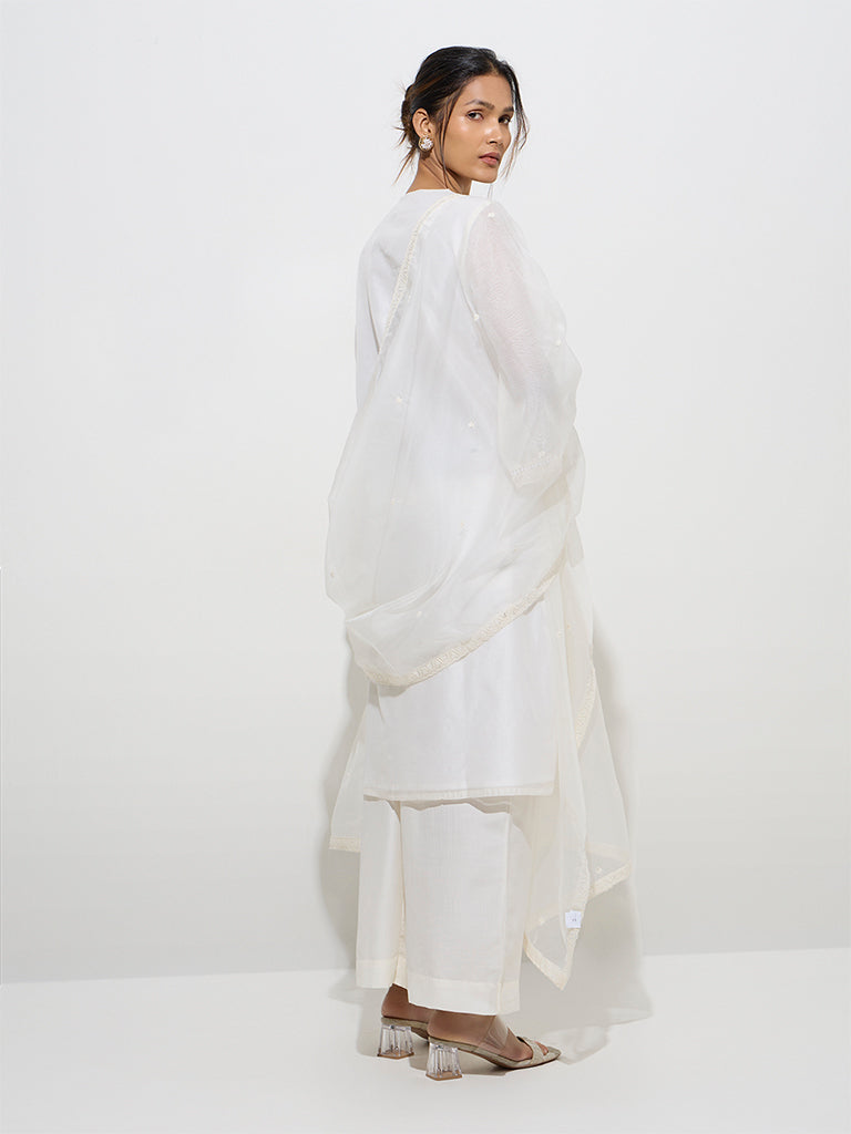 Vark Ivory Cotton-Blend Kurta. Palazzos and Dupatta Set