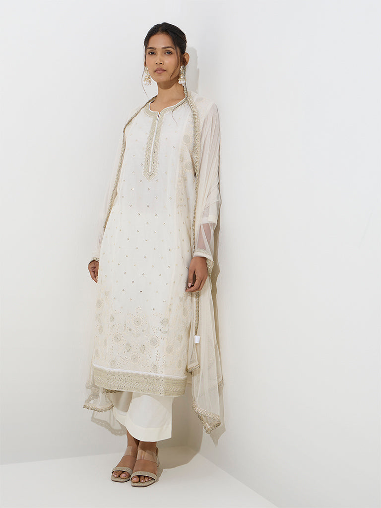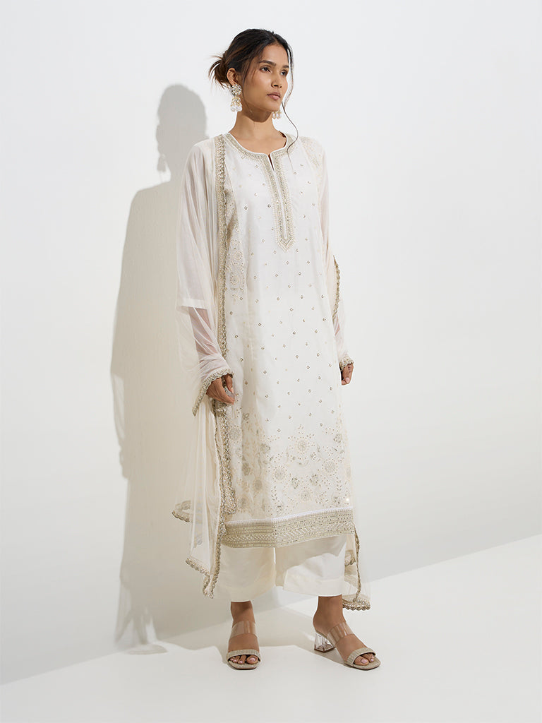 Vark Ivory Embroidered Straight Cotton-Blend Kurta. Pants and Dupatta Set
