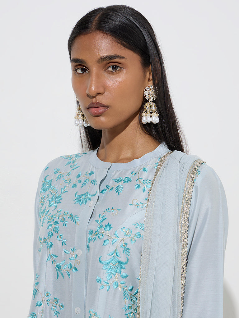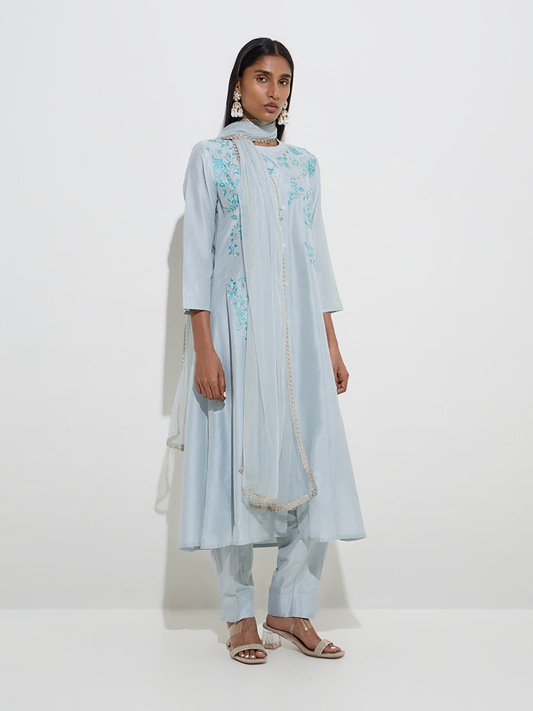 Vark Light Blue A-Line Kurta. Pants and Dupatta Set